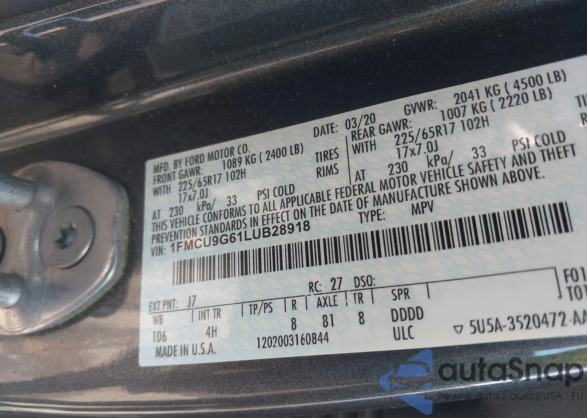 Samochód Ford Escape 2020 (VIN 1FMCU9G61LUB28918) był już licytowany 1 razy i/lub sprzedaje go niezweryfikowany sprzedawca. Zalecamy raport Carfax i potwierdzenie możliwości rejestracji pojazdu przed zakupem.