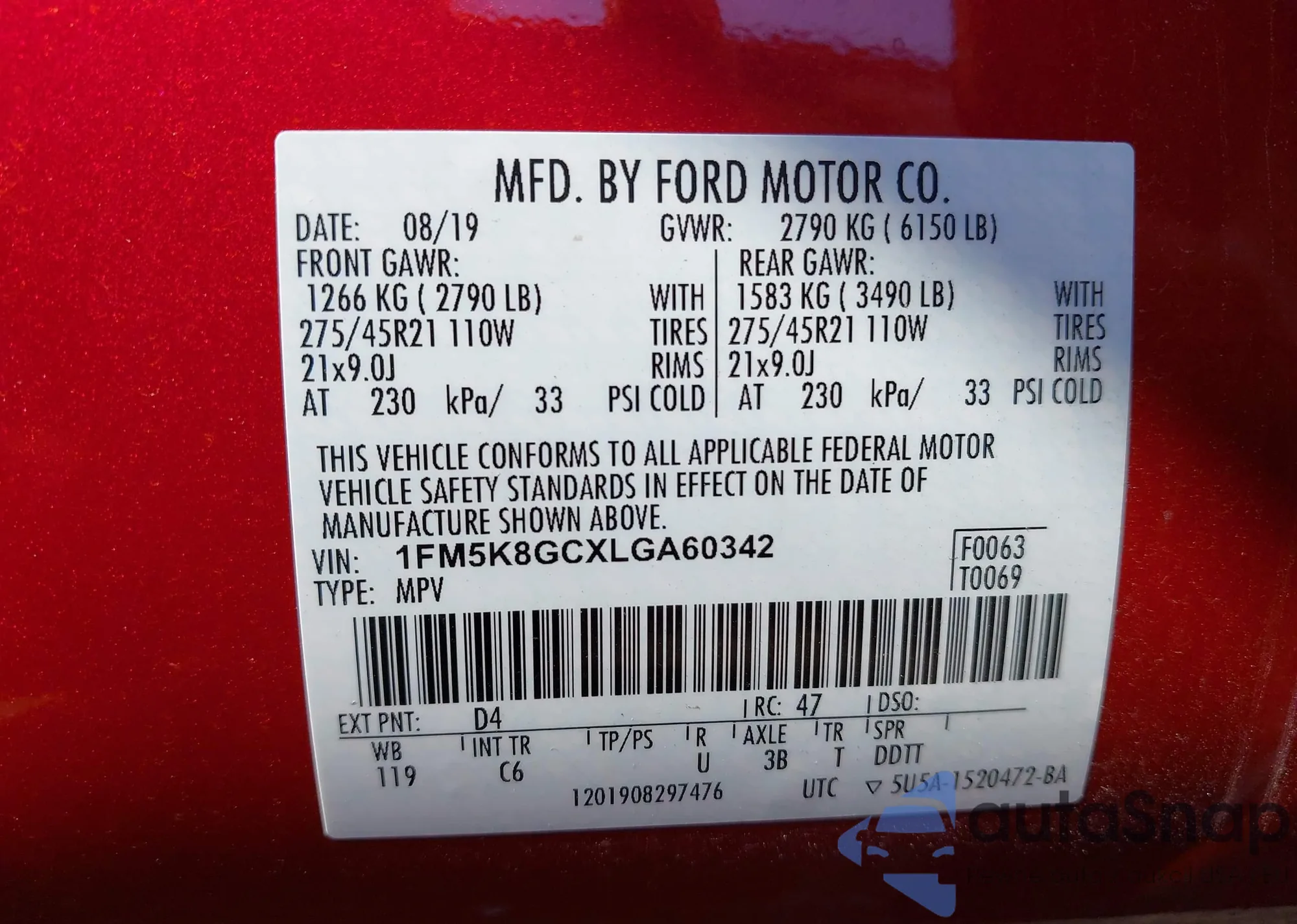 • VIN: 1FM5K8GCXLGA60342