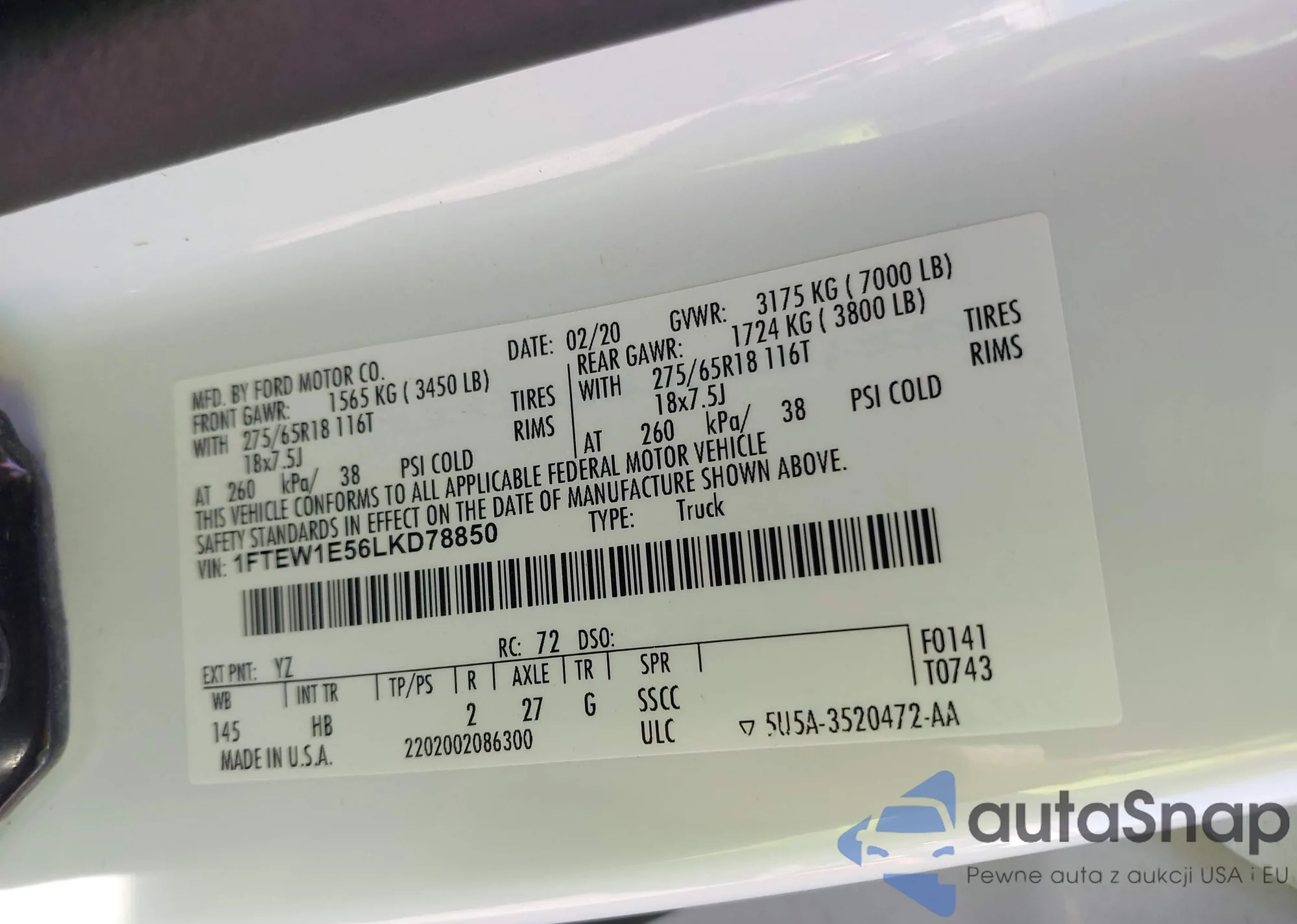 Samochód Ford F-150 2020 (VIN 1FTEW1E56LKD78850) nie był wcześniej licytowany. Dokumenty są czyste, przebieg odpowiada lub jest niższy niż średnia rynku. Sprzedaje go firma ubezpieczeniowa – polecamy zakup. Dostawa do portu zajmie ok. 6–8 tygodni.