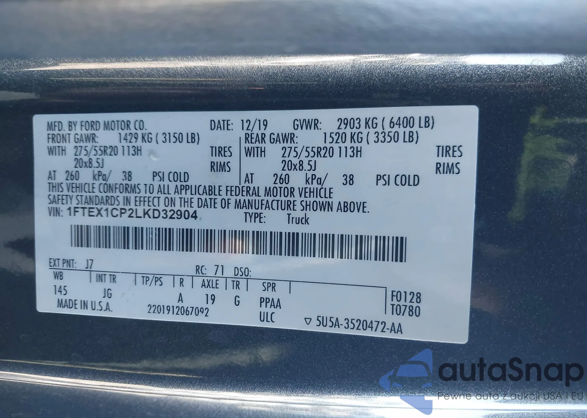 Samochód Ford F-150 2020 (VIN 1FTEX1CP2LKD32904) nie był wcześniej licytowany. Dokumenty są czyste, przebieg odpowiada lub jest niższy niż średnia rynku. Sprzedaje go firma ubezpieczeniowa – polecamy zakup. Dostawa do portu zajmie ok. 6–8 tygodni.