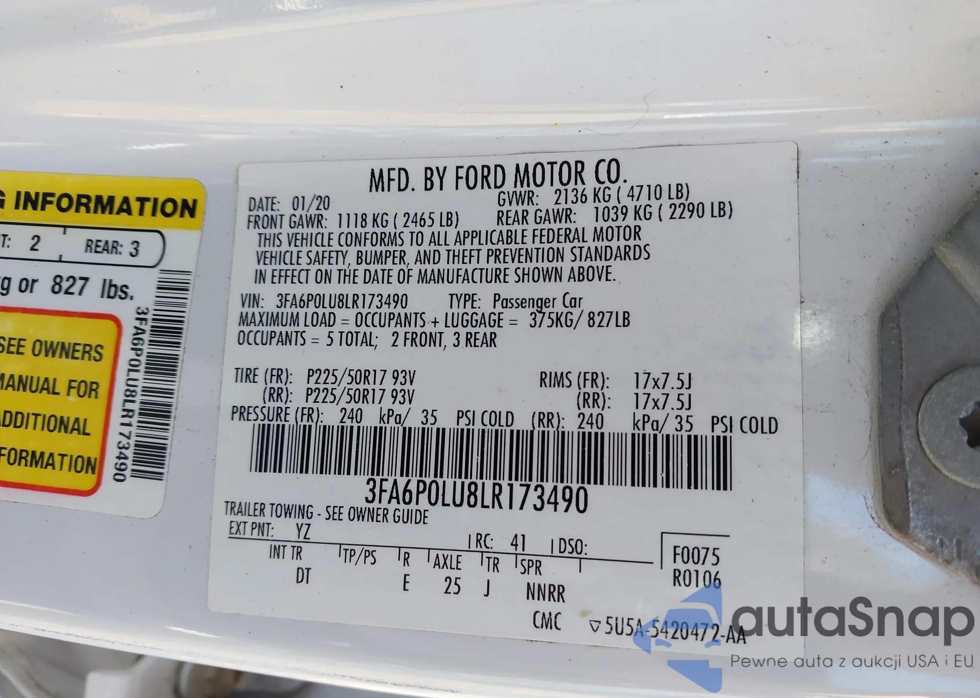 Samochód Ford Fusion 2020 (VIN 3FA6P0LU8LR173490) sprzedaje go niezweryfikowany sprzedawca. Zalecamy raport Carfax i potwierdzenie możliwości rejestracji pojazdu przed zakupem.