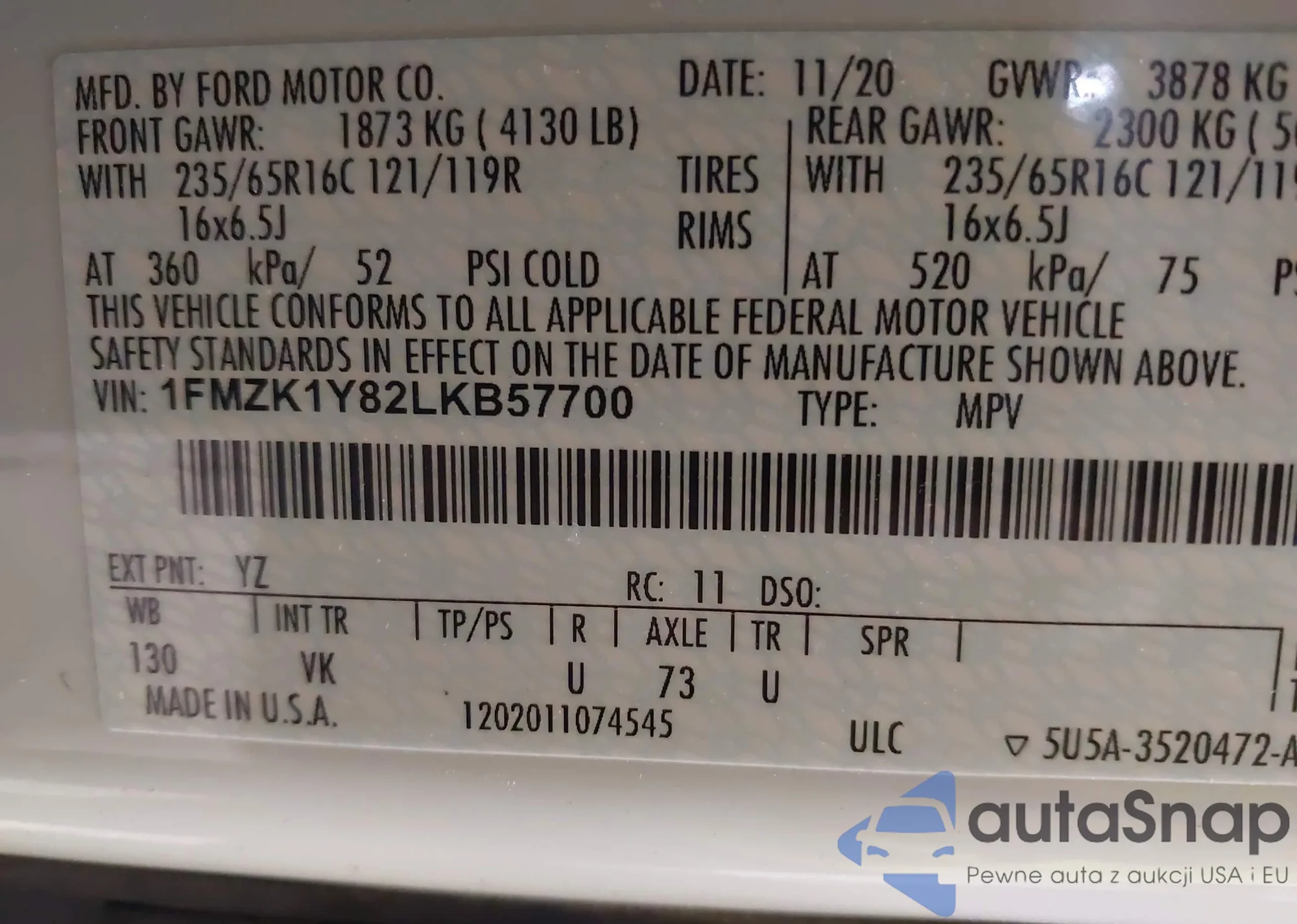 VIN: 1FMZK1Y82LKB57700