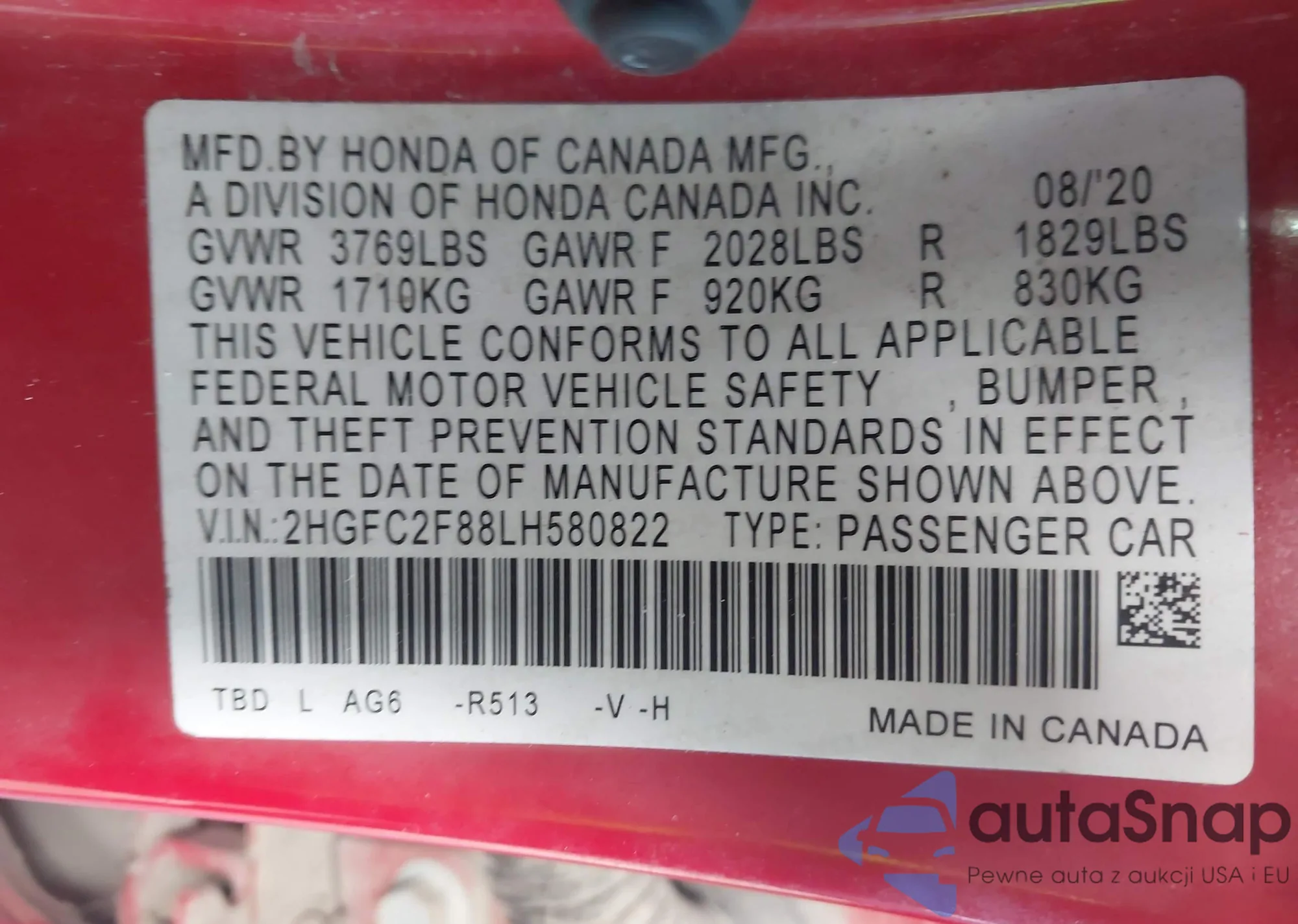 VIN: 2HGFC2F88LH580822
