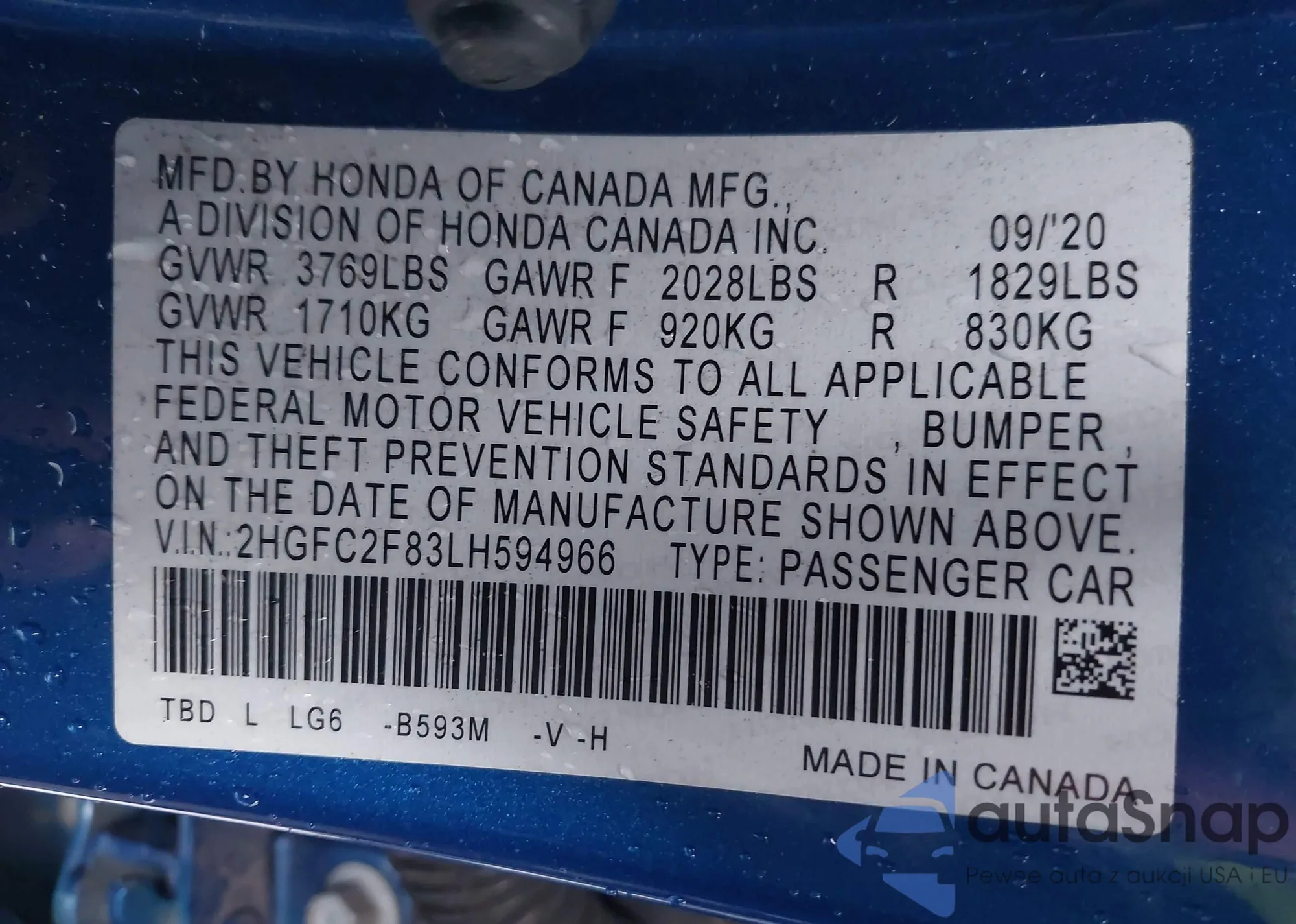 Samochód Honda Civic 2020 (VIN 2HGFC2F83LH594966) nie był wcześniej licytowany. Dokumenty są czyste, przebieg odpowiada lub jest niższy niż średnia rynku. Sprzedaje go firma ubezpieczeniowa – polecamy zakup. Dostawa do portu zajmie ok. 6–8 tygodni.