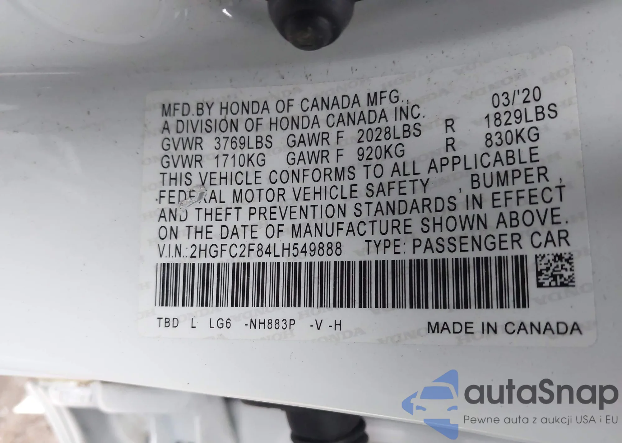 Samochód Honda Civic 2020 (VIN 2HGFC2F84LH549888) nie był wcześniej licytowany. Dokumenty są czyste, przebieg odpowiada lub jest niższy niż średnia rynku. Sprzedaje go firma ubezpieczeniowa – polecamy zakup. Dostawa do portu zajmie ok. 6–8 tygodni.