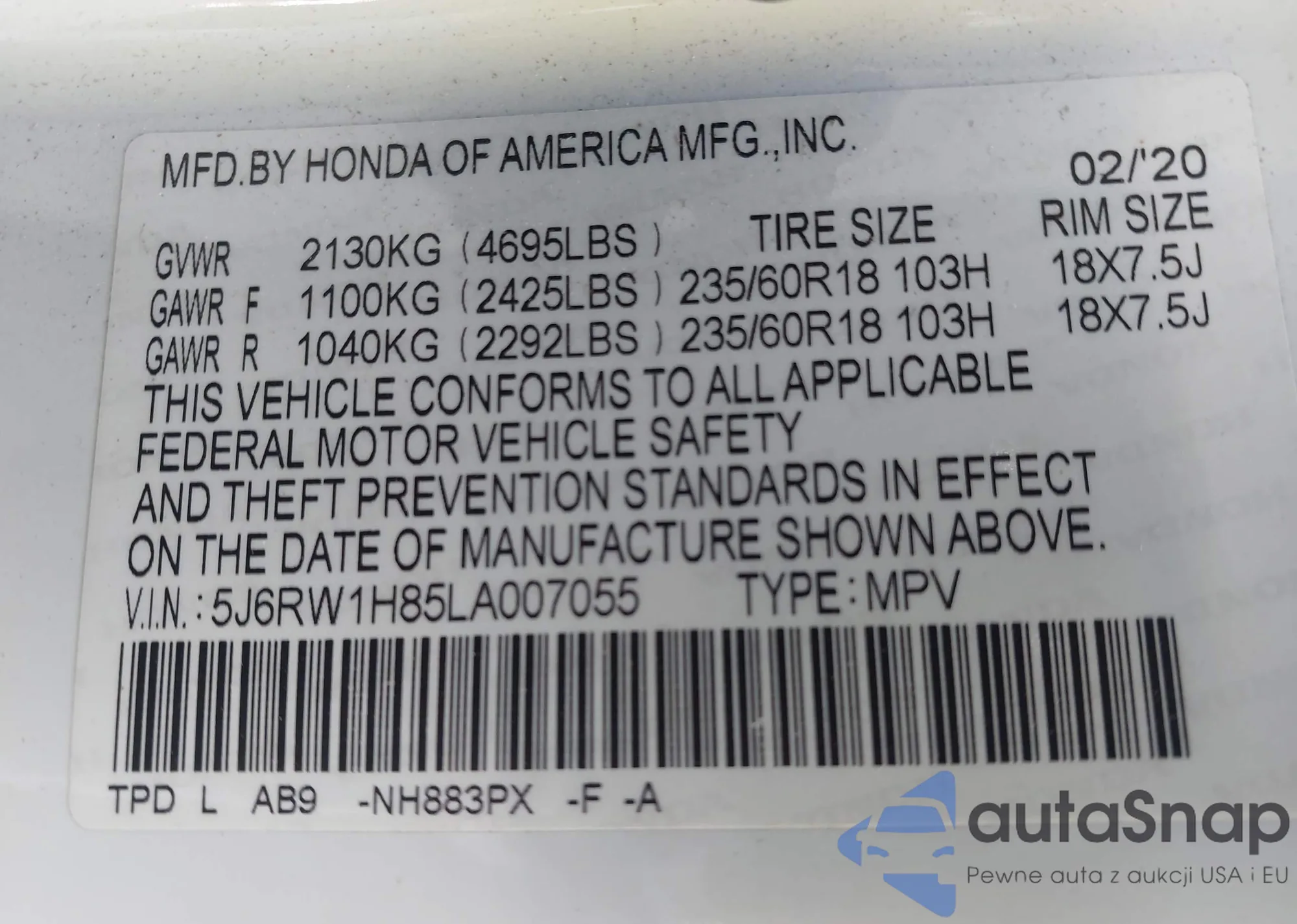 VIN: 5J6RW1H85LA007055