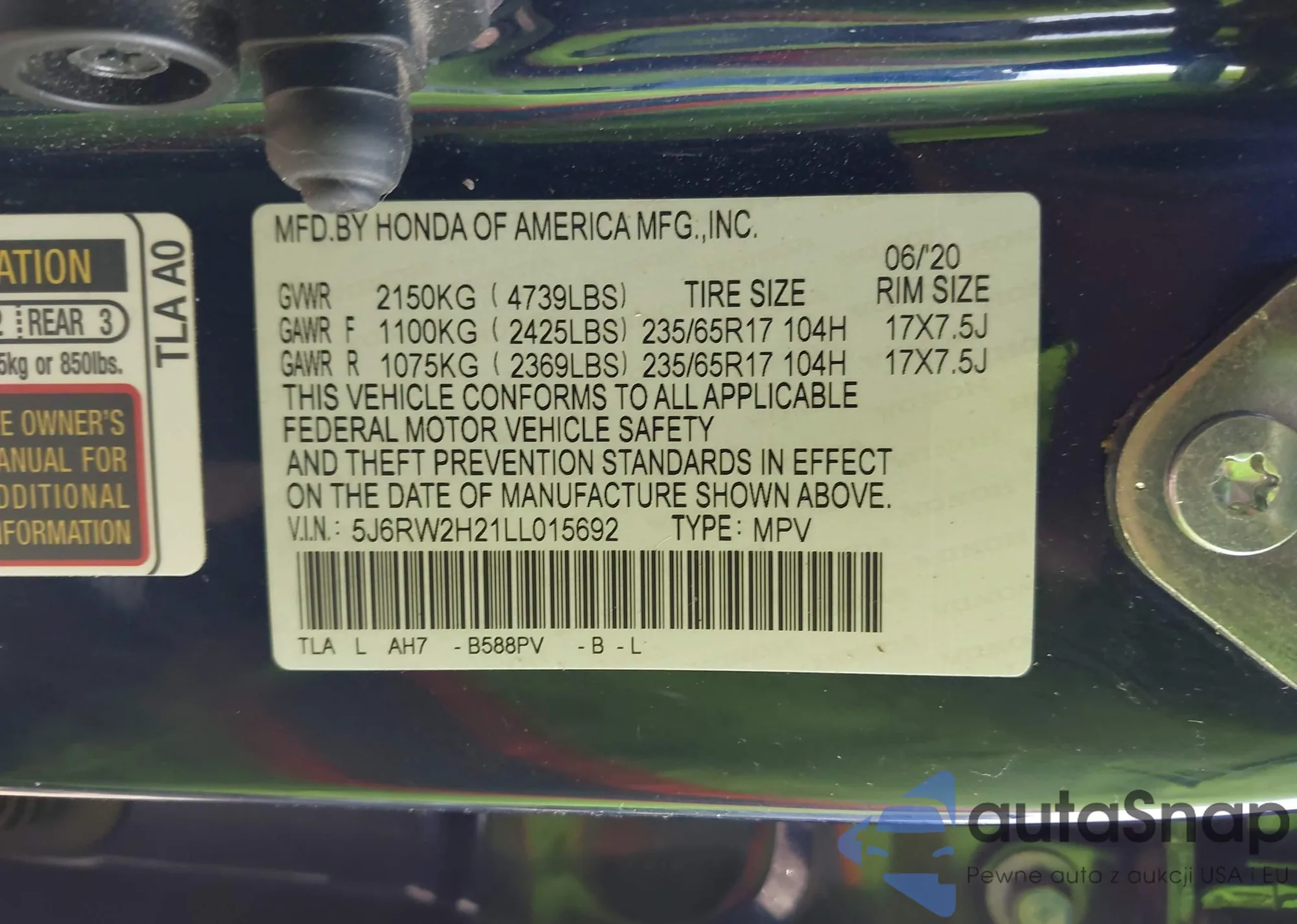 VIN: 5J6RW2H21LL015692