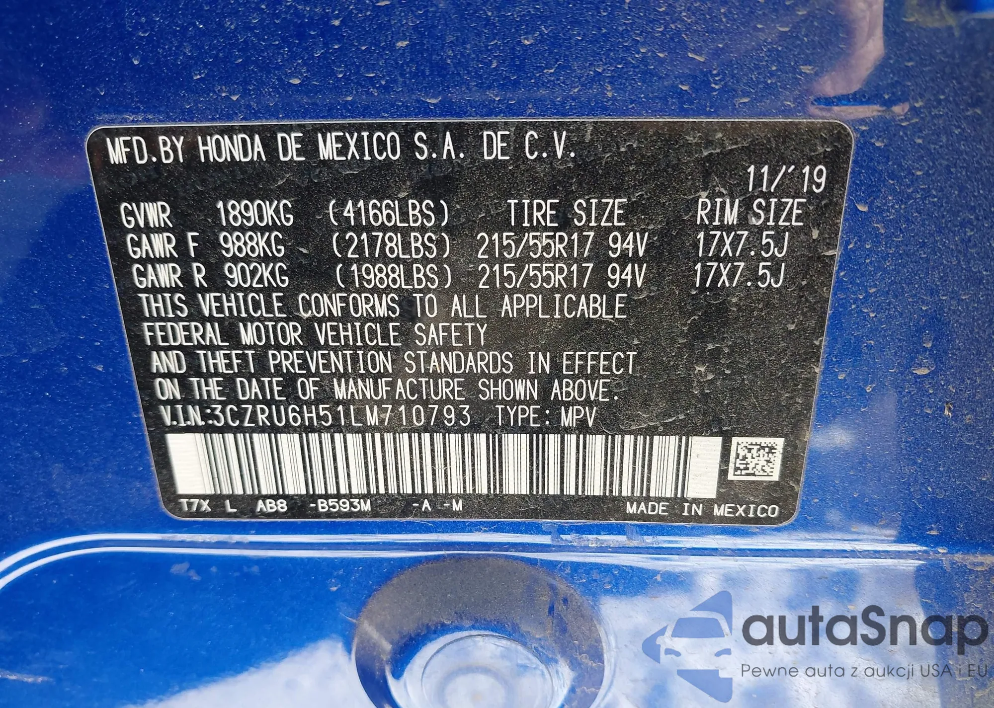 Samochód Honda HR-V 2020 (VIN 3CZRU6H51LM710793) nie był wcześniej licytowany. Dokumenty są czyste, przebieg odpowiada lub jest niższy niż średnia rynku. Sprzedaje go firma ubezpieczeniowa – polecamy zakup. Dostawa do portu zajmie ok. 6–8 tygodni.