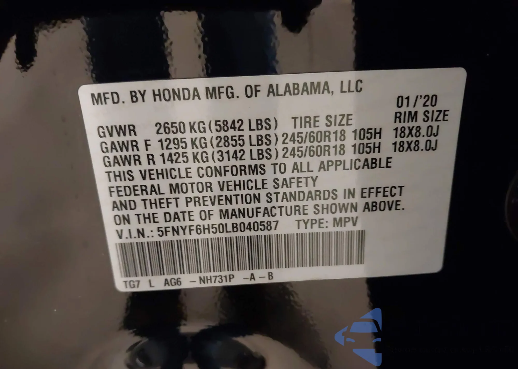 VIN: 5FNYF6H50LB040587