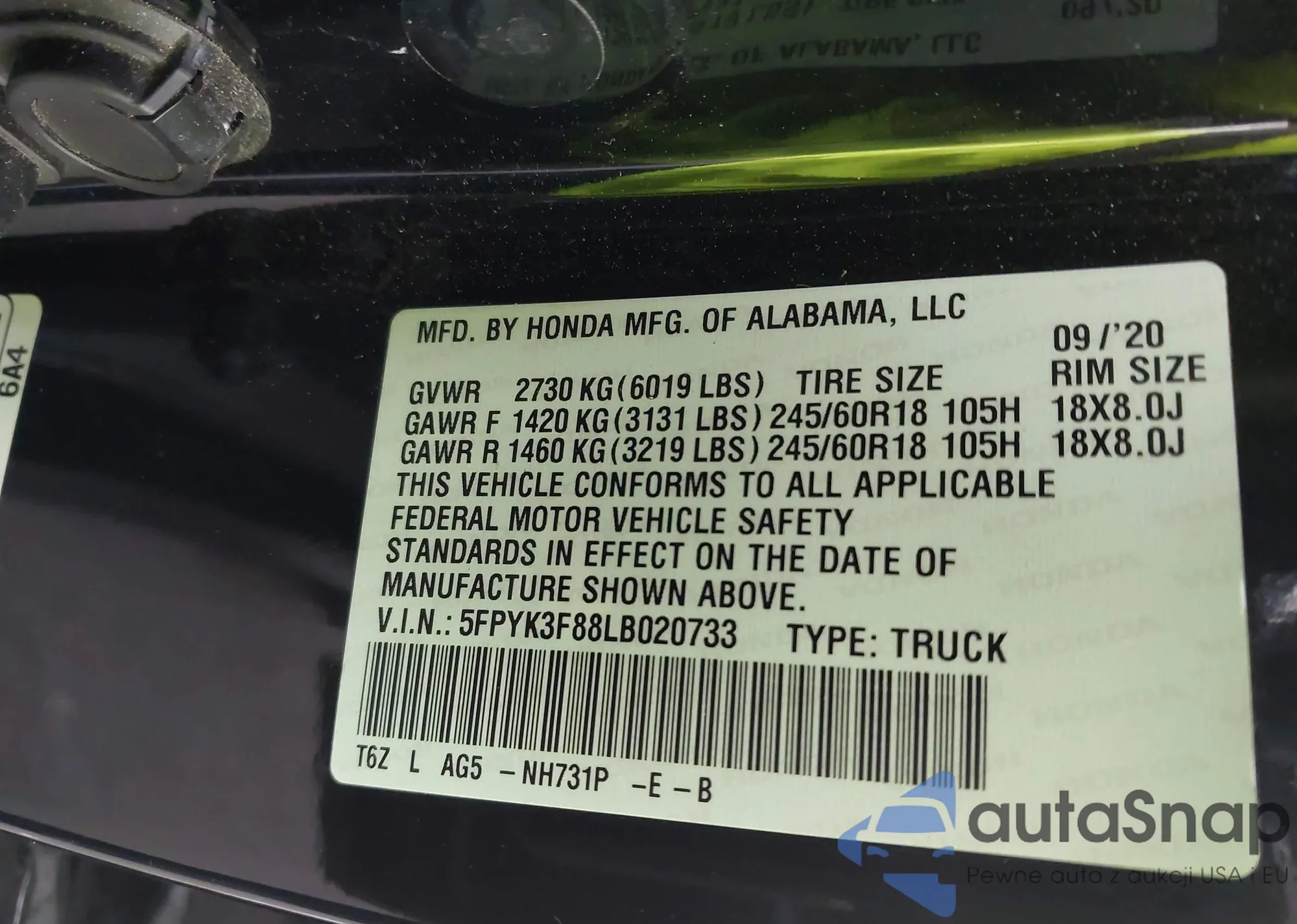 • VIN: 5FPYK3F88LB020733