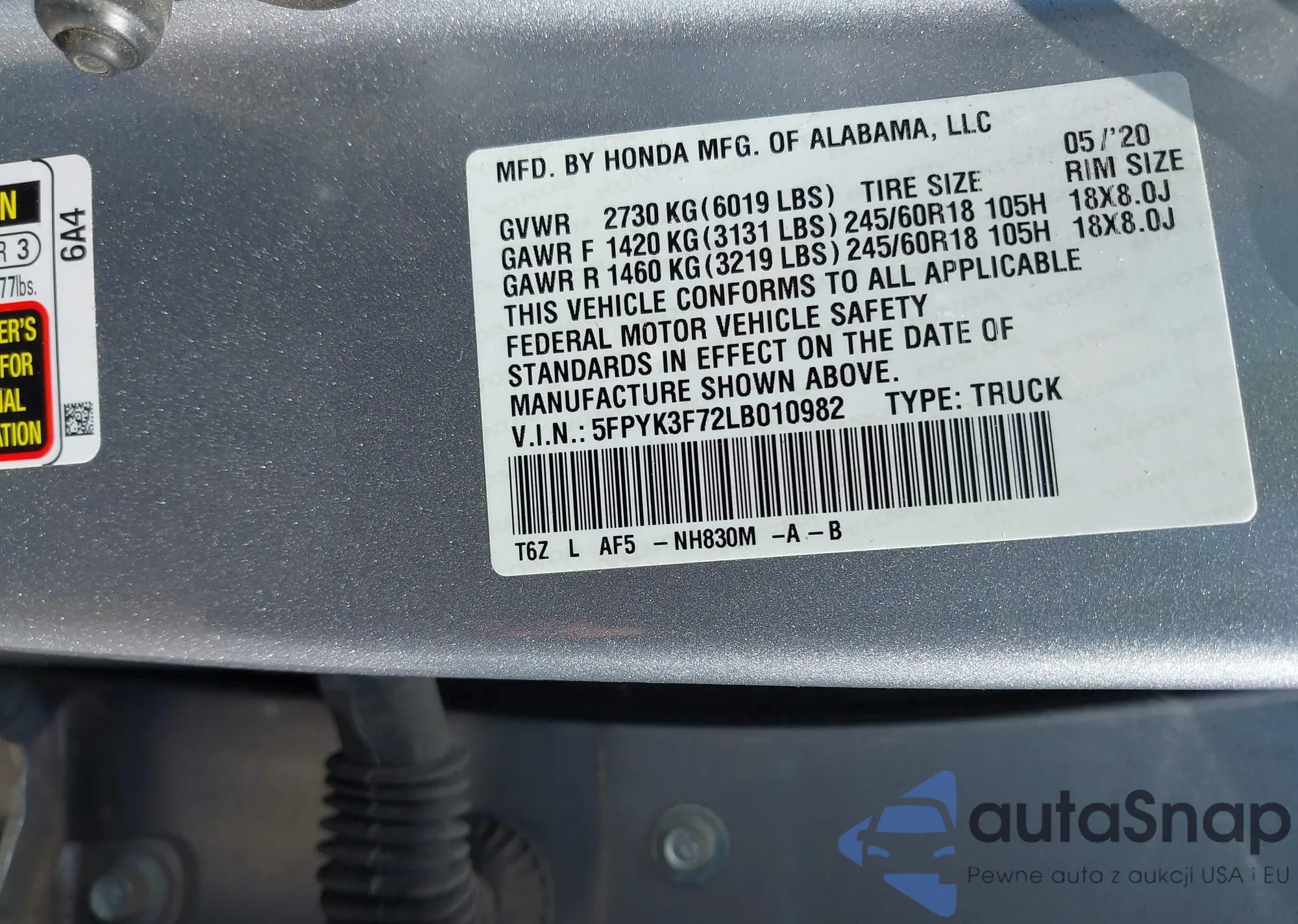 VIN: 5FPYK3F72LB010982