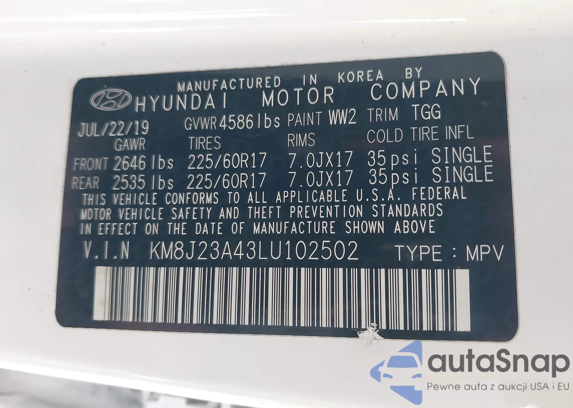 Samochód Hyundai Tucson 2020 (VIN KM8J23A43LU102502) nie był wcześniej licytowany. Dokumenty są czyste, przebieg odpowiada lub jest niższy niż średnia rynku. Sprzedaje go firma ubezpieczeniowa – polecamy zakup. Dostawa do portu zajmie ok. 6–8 tygodni.