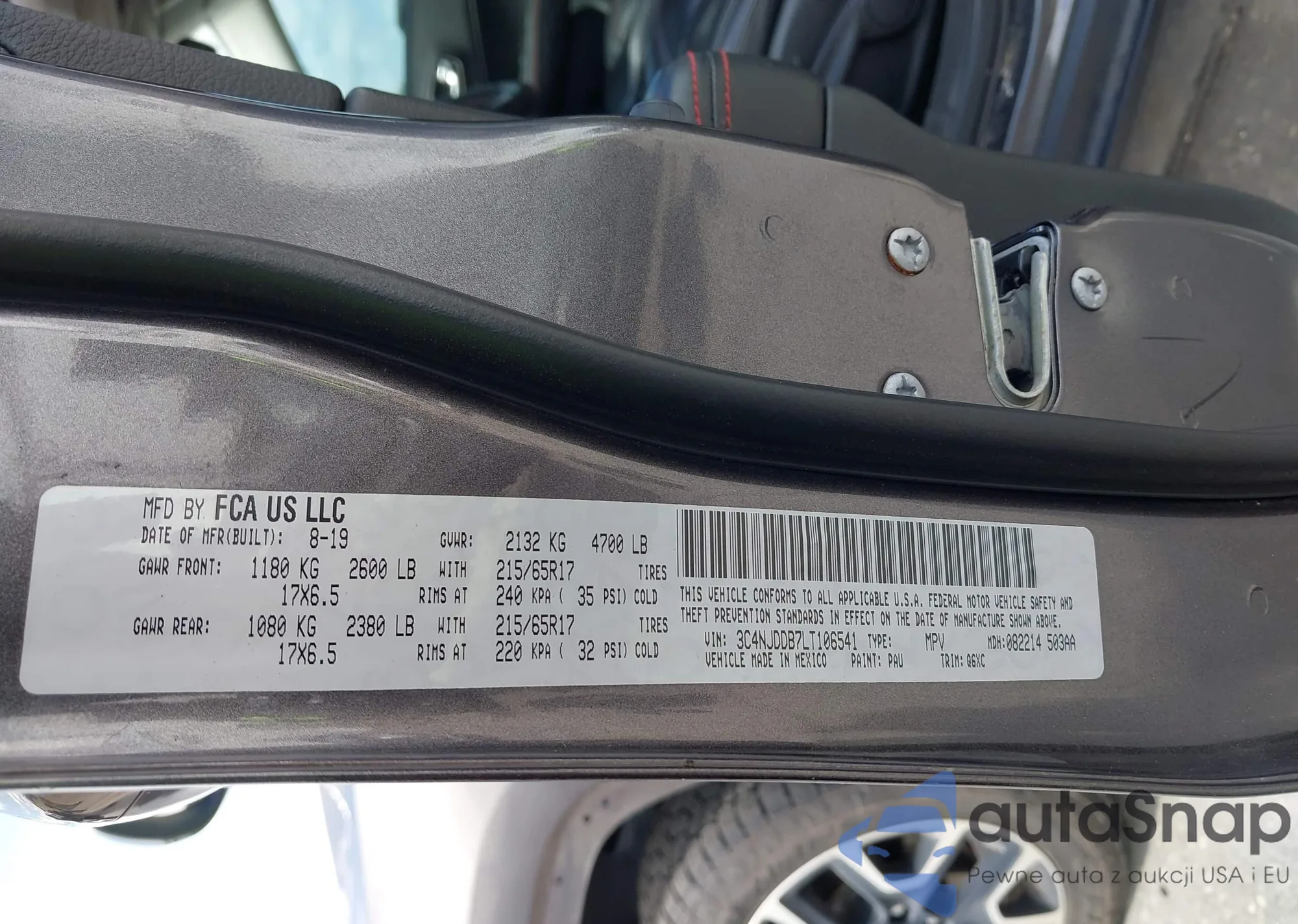 Samochód Jeep Compass 2020 (VIN 3C4NJDDB7LT106541) ma dokumenty uniemożliwiające rejestrację. Mogą pojawić się trudności przy eksporcie i rejestracji. Skontaktuj się z ekspertami AutaSnap w celu znalezienia alternatywy.