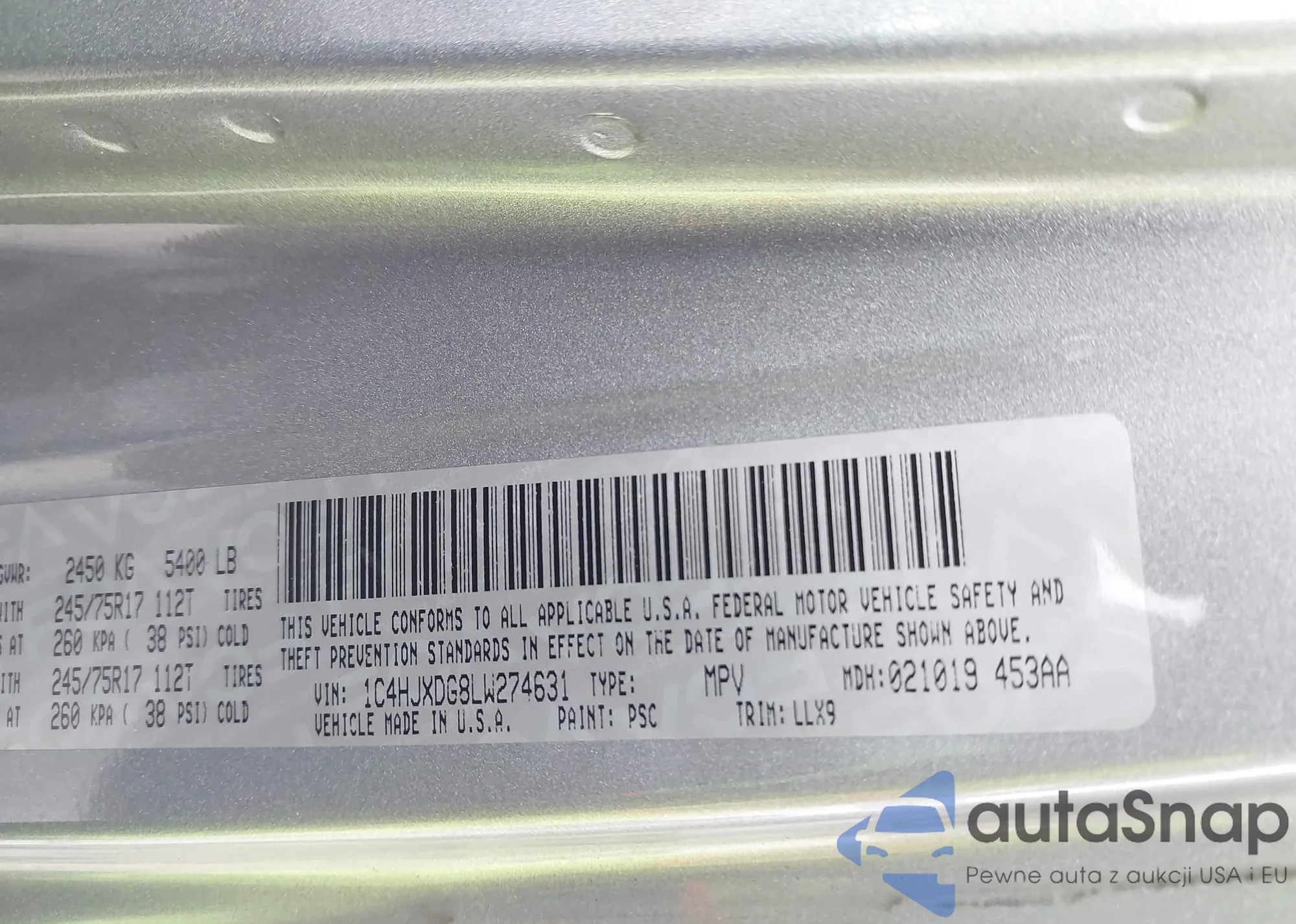 VIN: 1C4HJXDG8LW274631