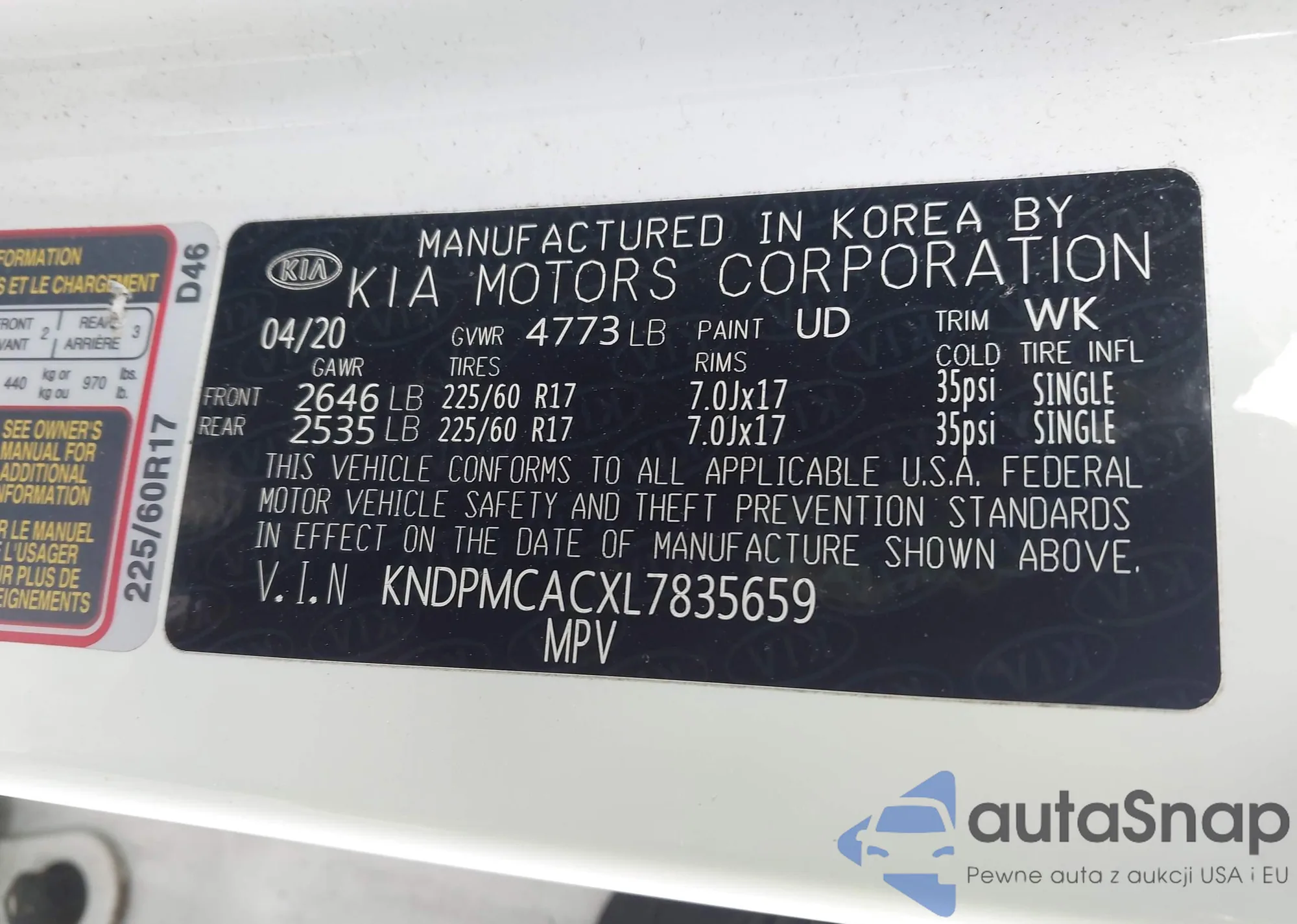 Samochód Kia Sportage 2020 (VIN KNDPMCACXL7835659) nie był wcześniej licytowany. Dokumenty są czyste, przebieg odpowiada lub jest niższy niż średnia rynku. Sprzedaje go firma ubezpieczeniowa – polecamy zakup. Dostawa do portu zajmie ok. 6–8 tygodni.