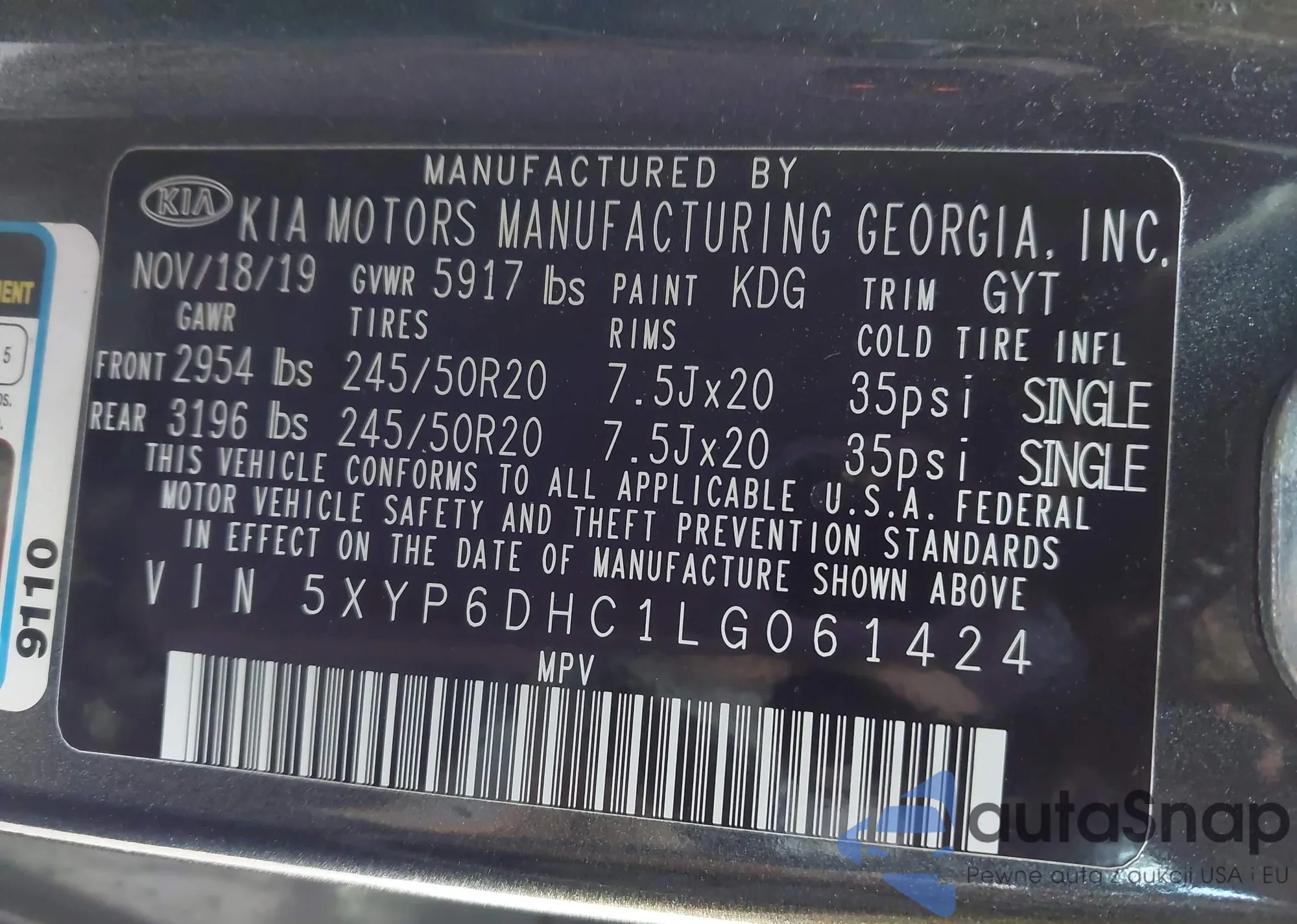 VIN: 5XYP6DHC1LG061424