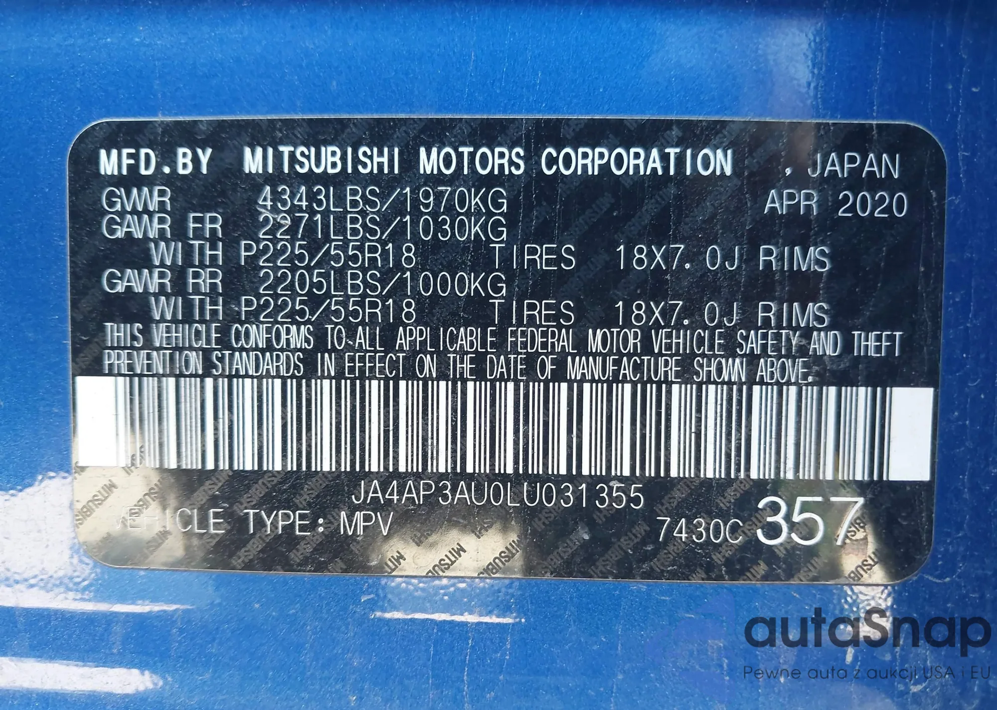 Samochód Mitsubishi Outlander 2020 (VIN JA4AP3AU0LU031355) ma dokumenty uniemożliwiające rejestrację. Mogą pojawić się trudności przy eksporcie i rejestracji. Skontaktuj się z ekspertami AutaSnap w celu znalezienia alternatywy.