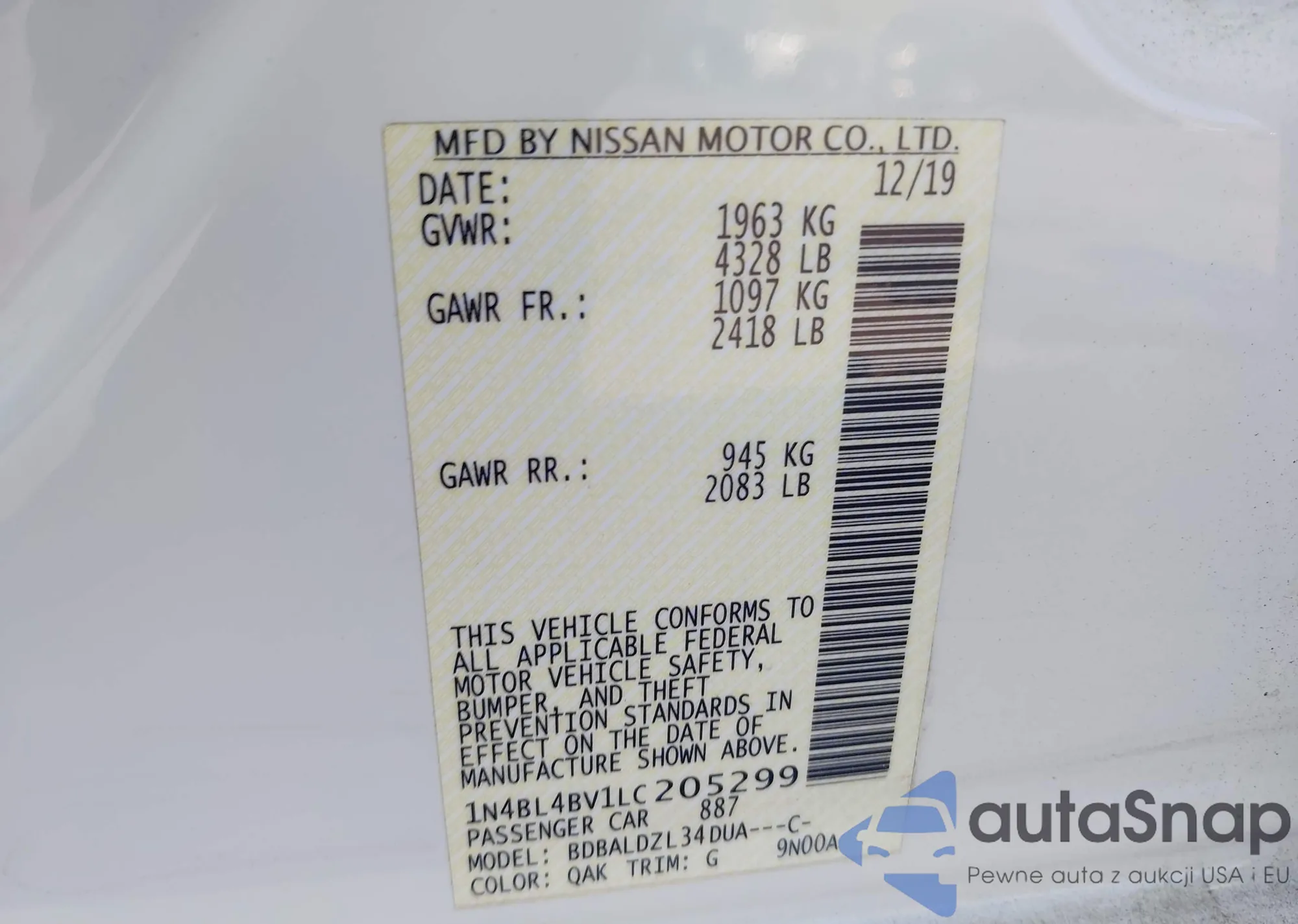 • VIN: 1N4BL4BV1LC205299