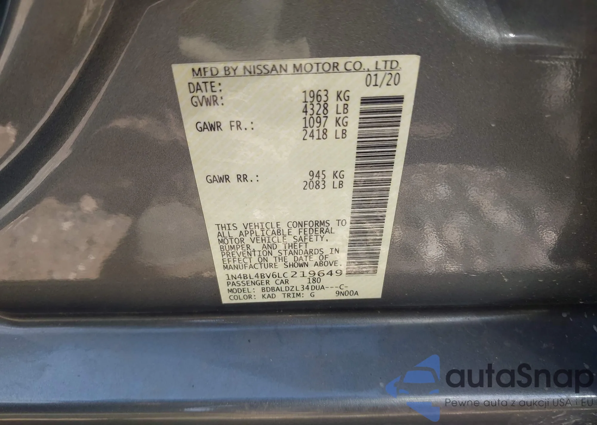 Samochód Nissan Altima 2020 (VIN 1N4BL4BV6LC219649) sprzedaje go niezweryfikowany sprzedawca. Zalecamy raport Carfax i potwierdzenie możliwości rejestracji pojazdu przed zakupem.