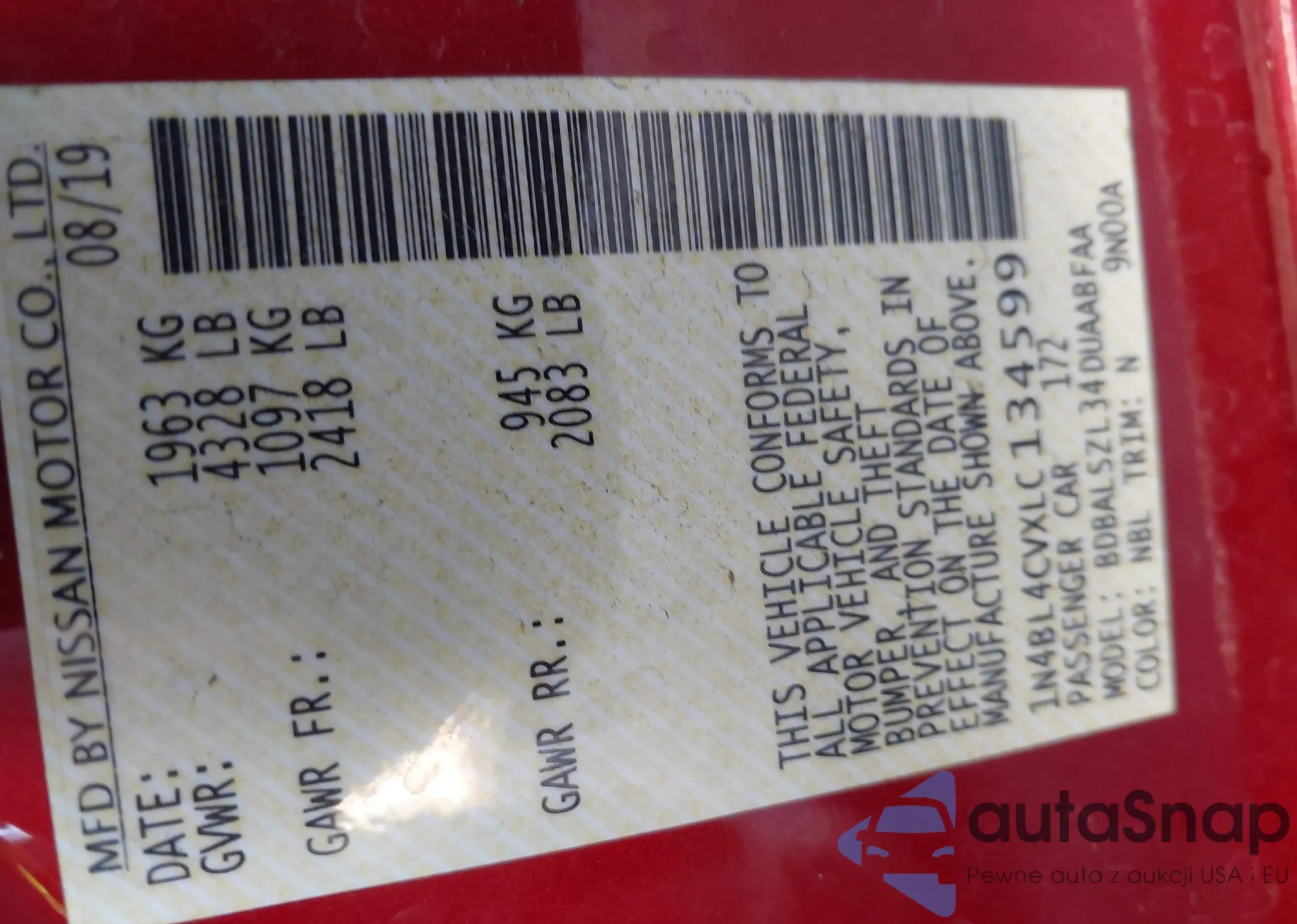 • VIN: 1N4BL4CVXLC134599