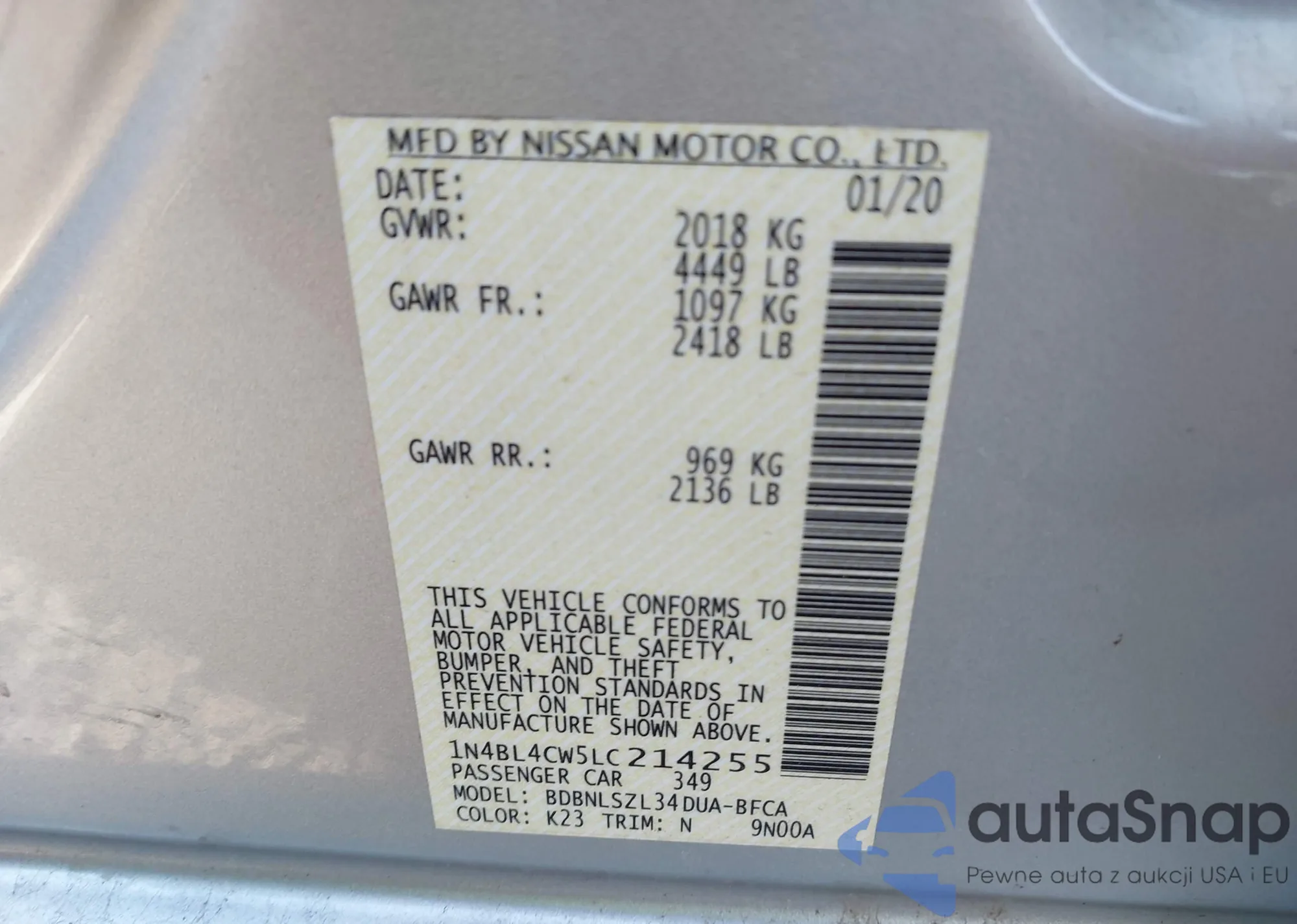 Samochód Nissan Altima 2020 (VIN 1N4BL4CW5LC214255) nie był wcześniej licytowany. Dokumenty są czyste, przebieg odpowiada lub jest niższy niż średnia rynku. Sprzedaje go firma ubezpieczeniowa – polecamy zakup. Dostawa do portu zajmie ok. 6–8 tygodni.