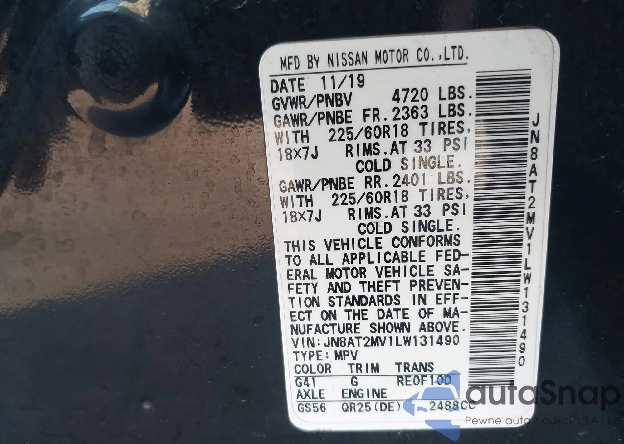 Samochód Nissan Rogue 2020 (VIN JN8AT2MV1LW131490) nie był wcześniej licytowany. Dokumenty są czyste, przebieg odpowiada lub jest niższy niż średnia rynku. Sprzedaje go firma ubezpieczeniowa – polecamy zakup. Dostawa do portu zajmie ok. 6–8 tygodni.