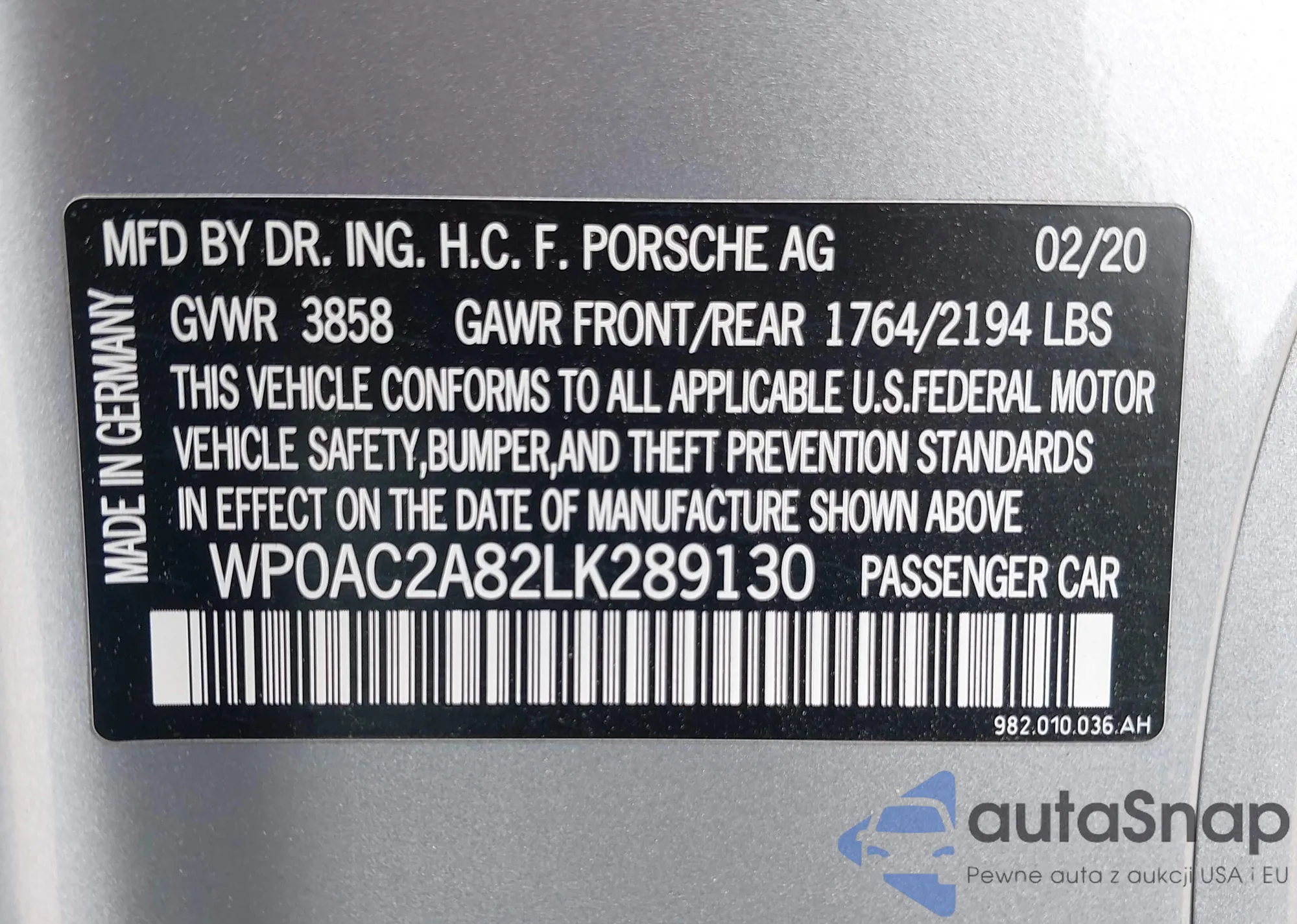 VIN: WP0AC2A82LK289130