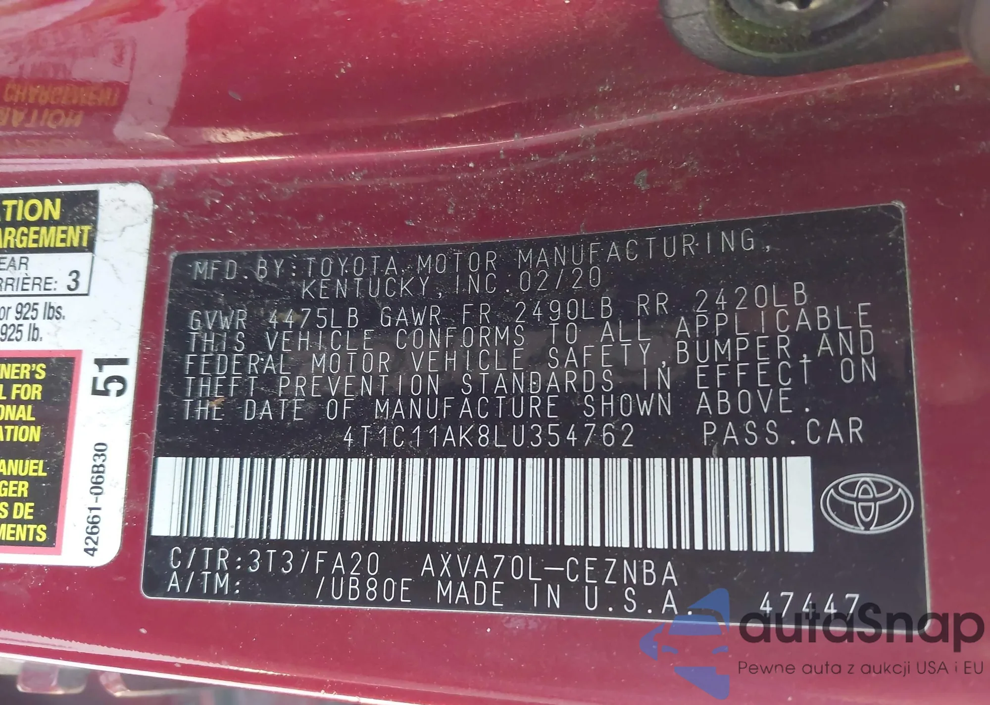 Samochód Toyota Camry 2020 (VIN 4T1C11AK8LU354762) nie był wcześniej licytowany. Dokumenty są czyste, przebieg odpowiada lub jest niższy niż średnia rynku. Sprzedaje go firma ubezpieczeniowa – polecamy zakup. Dostawa do portu zajmie ok. 6–8 tygodni.
