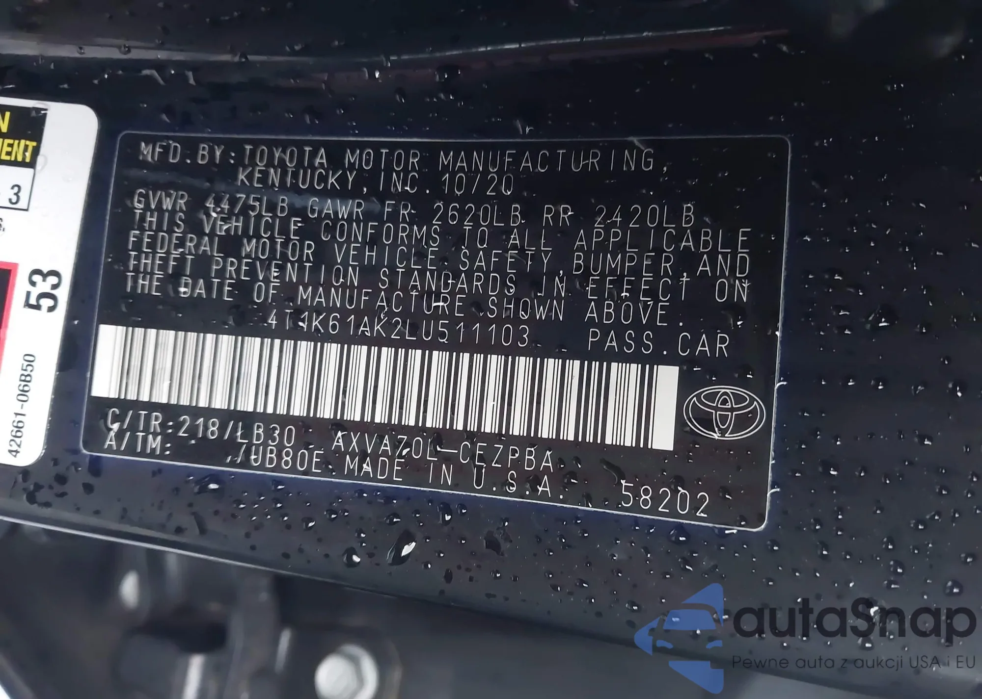 Samochód Toyota Camry 2020 (VIN 4T1K61AK2LU511103) nie był wcześniej licytowany. Dokumenty są czyste, przebieg odpowiada lub jest niższy niż średnia rynku. Sprzedaje go firma ubezpieczeniowa – polecamy zakup. Dostawa do portu zajmie ok. 6–8 tygodni.