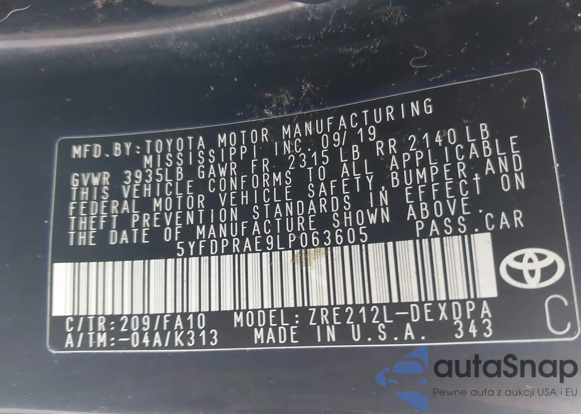 • VIN: 5YFDPRAE9LP063605
