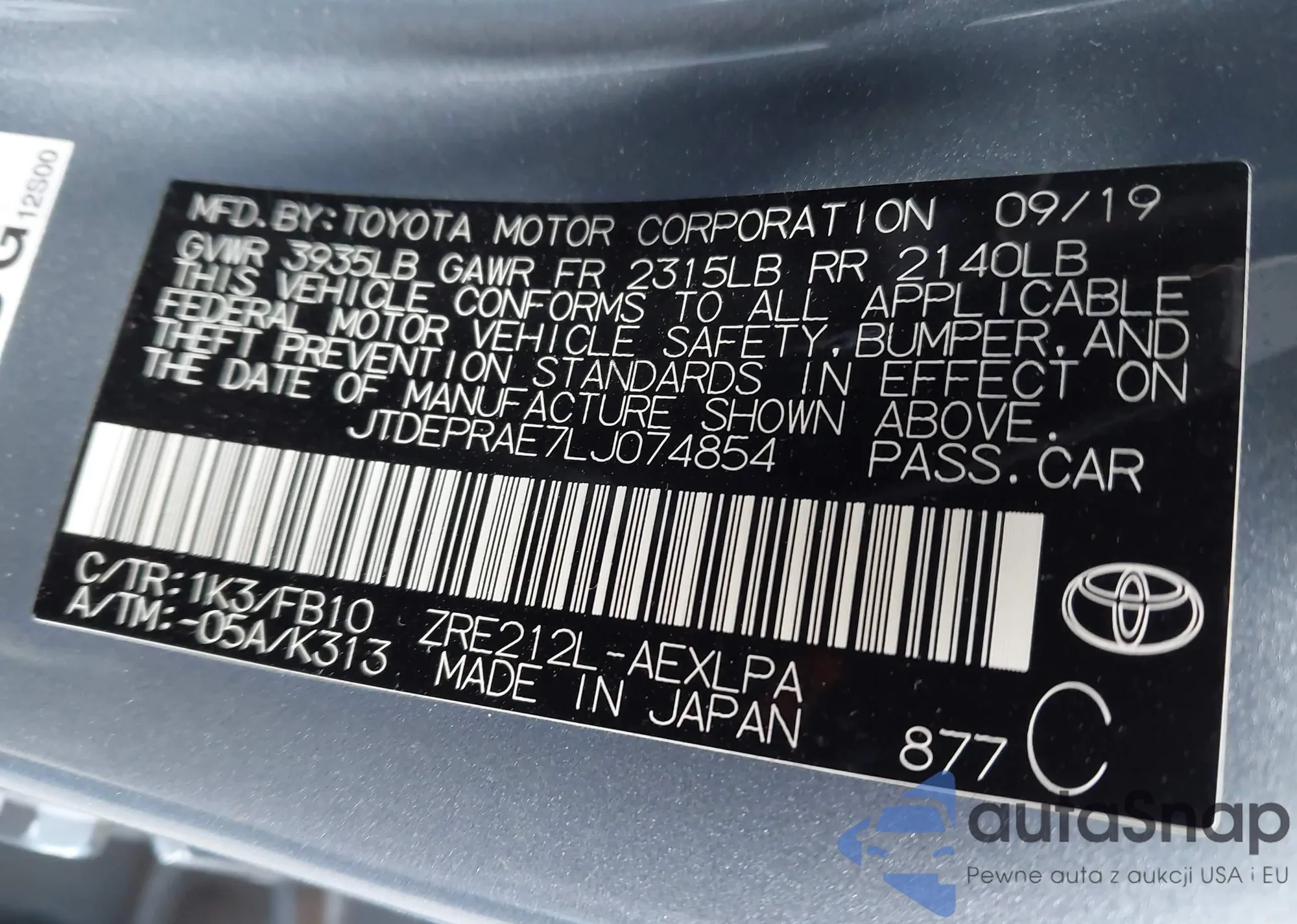 VIN: JTDEPRAE7LJ074854