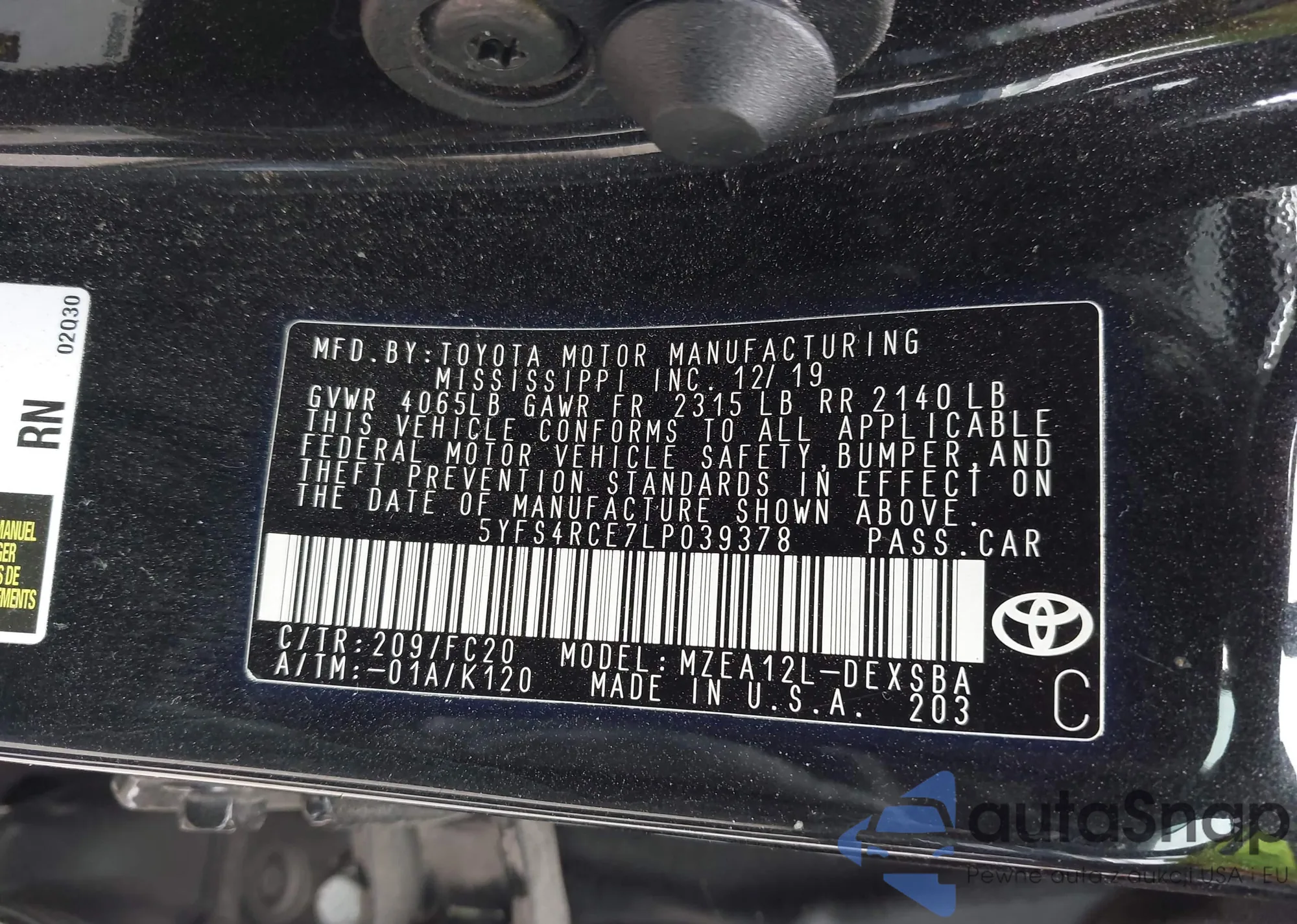 Samochód Toyota Corolla 2020 (VIN 5YFS4RCE7LP039378) nie był wcześniej licytowany. Dokumenty są czyste, przebieg odpowiada lub jest niższy niż średnia rynku. Sprzedaje go firma ubezpieczeniowa – polecamy zakup. Dostawa do portu zajmie ok. 6–8 tygodni.