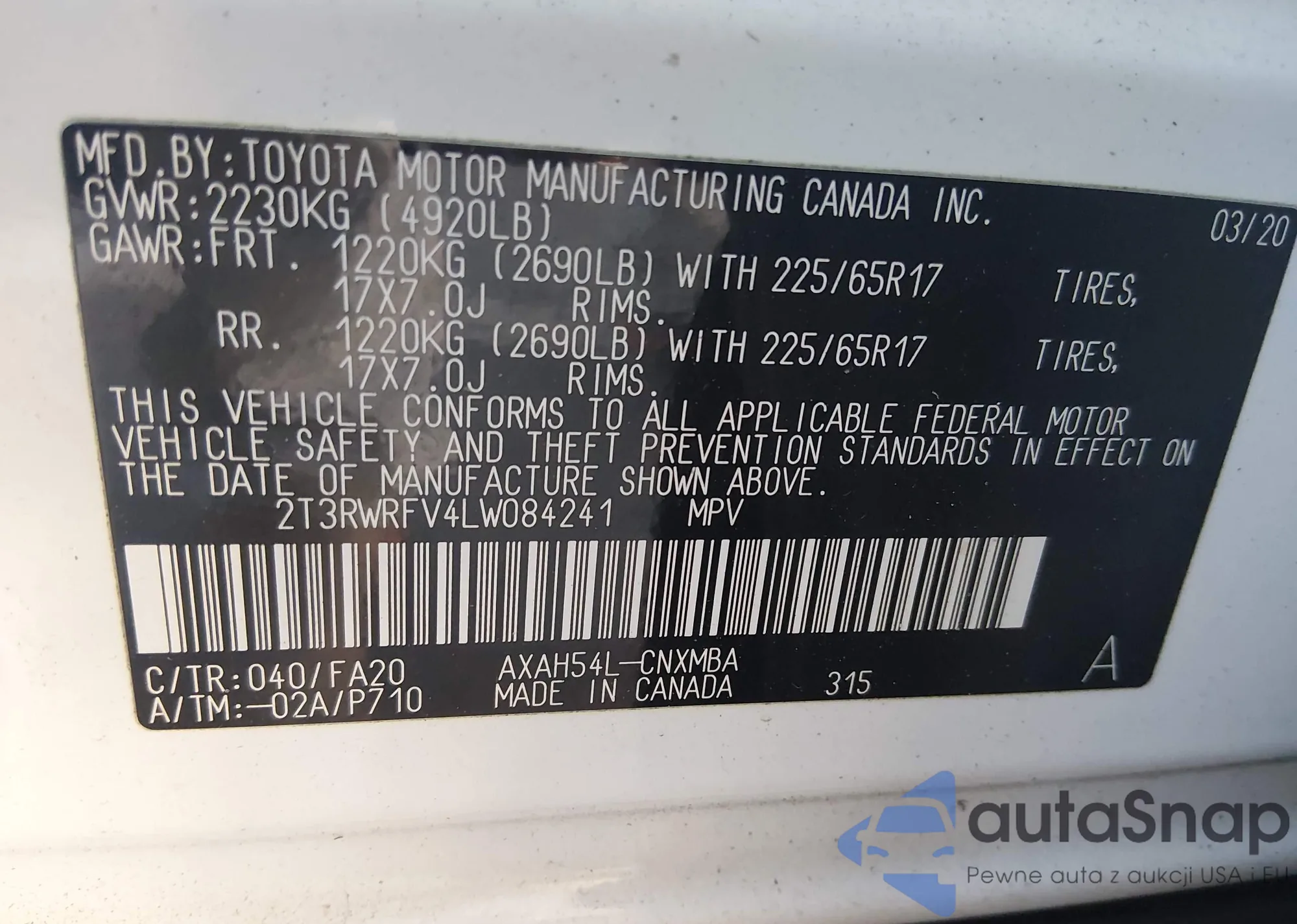 Samochód Toyota RAV 4 2020 (VIN 2T3RWRFV4LW084241) nie był wcześniej licytowany. Dokumenty są czyste, przebieg odpowiada lub jest niższy niż średnia rynku. Sprzedaje go firma ubezpieczeniowa – polecamy zakup. Dostawa do portu zajmie ok. 6–8 tygodni.