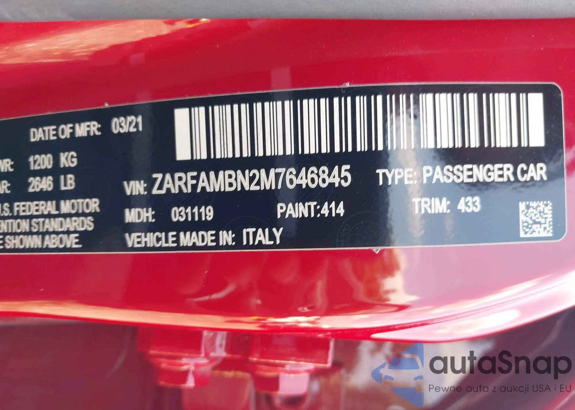 Samochód Alfa Romeo Giulia 2021 (VIN ZARFAMBN2M7646845) ma dokumenty uniemożliwiające rejestrację. Mogą pojawić się trudności przy eksporcie i rejestracji. Skontaktuj się z ekspertami AutaSnap w celu znalezienia alternatywy.