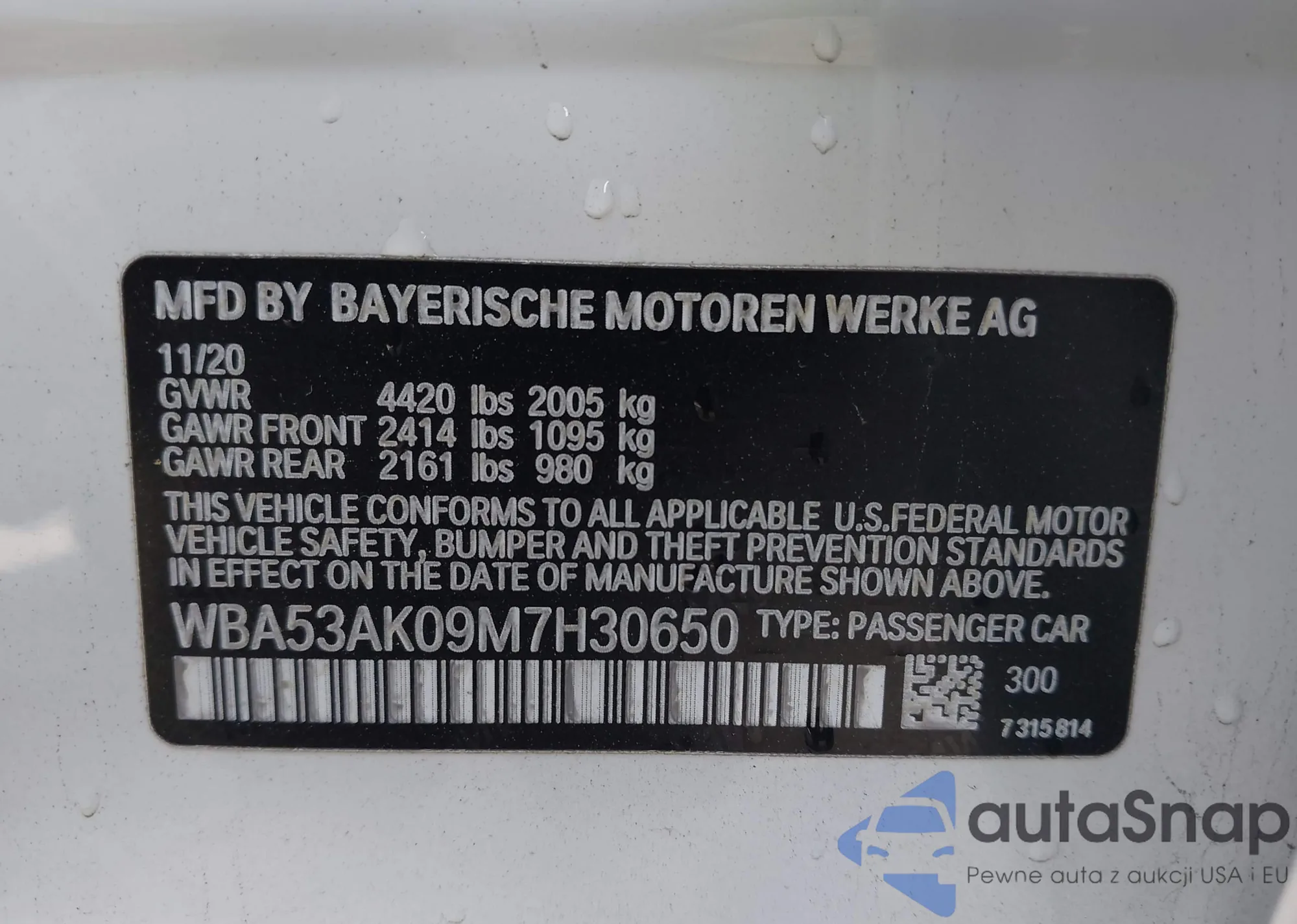 VIN: WBA53AK09M7H30650