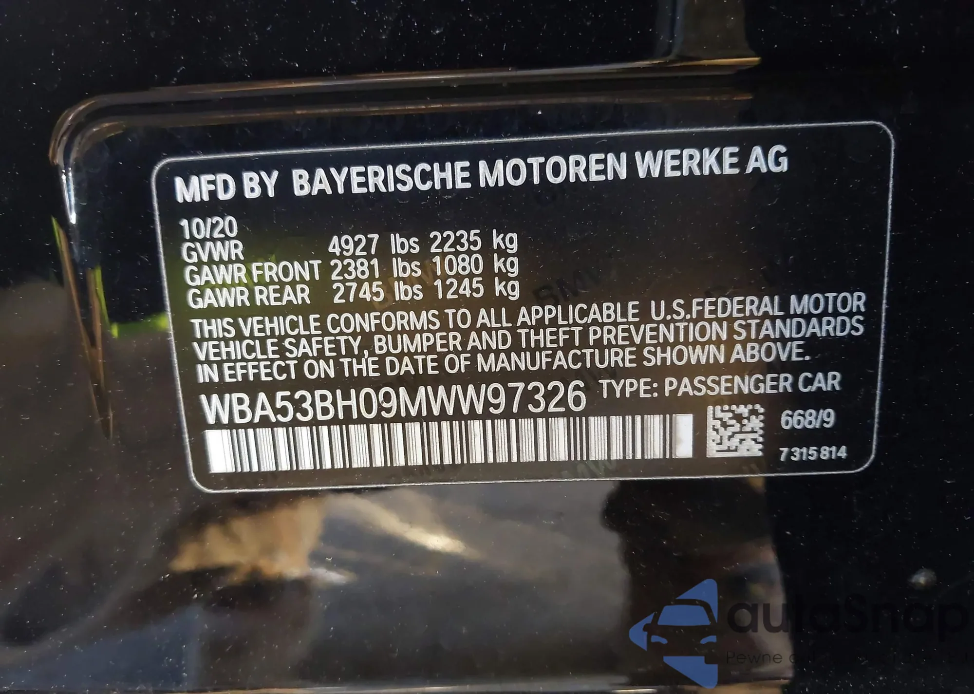• VIN: WBA53BH09MWW97326