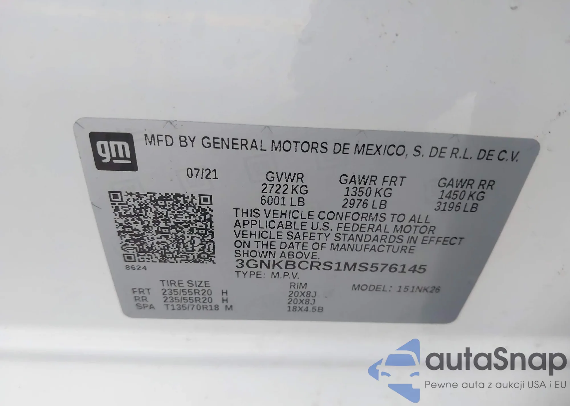 VIN: 3GNKBCRS1MS576145