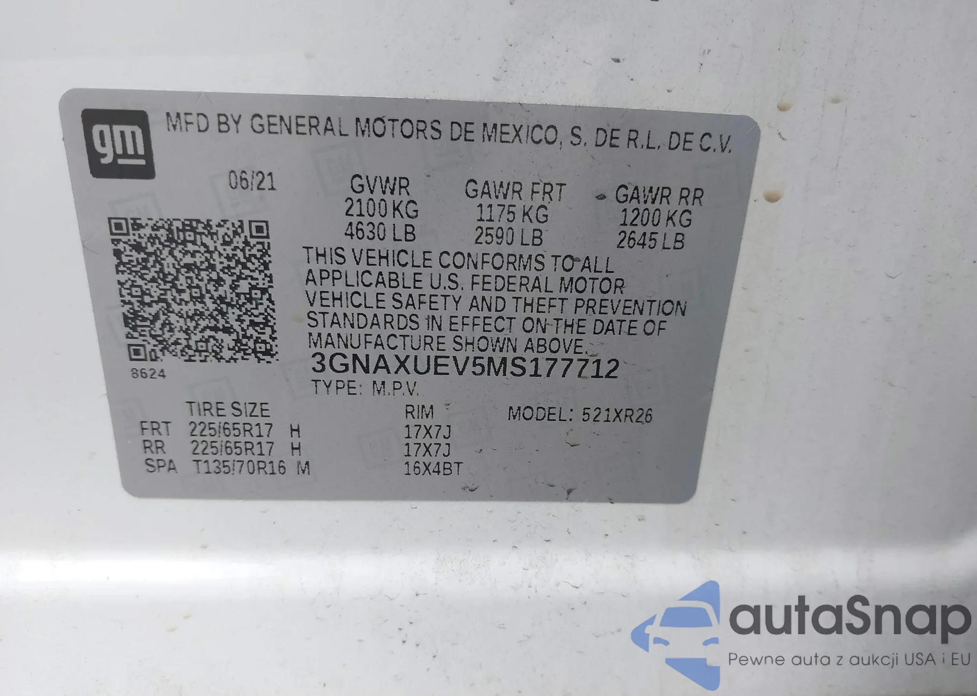 Samochód Chevrolet Equinox 2021 (VIN 3GNAXUEV5MS177712) nie był wcześniej licytowany. Dokumenty są czyste, przebieg odpowiada lub jest niższy niż średnia rynku. Sprzedaje go firma ubezpieczeniowa – polecamy zakup. Dostawa do portu zajmie ok. 6–8 tygodni.