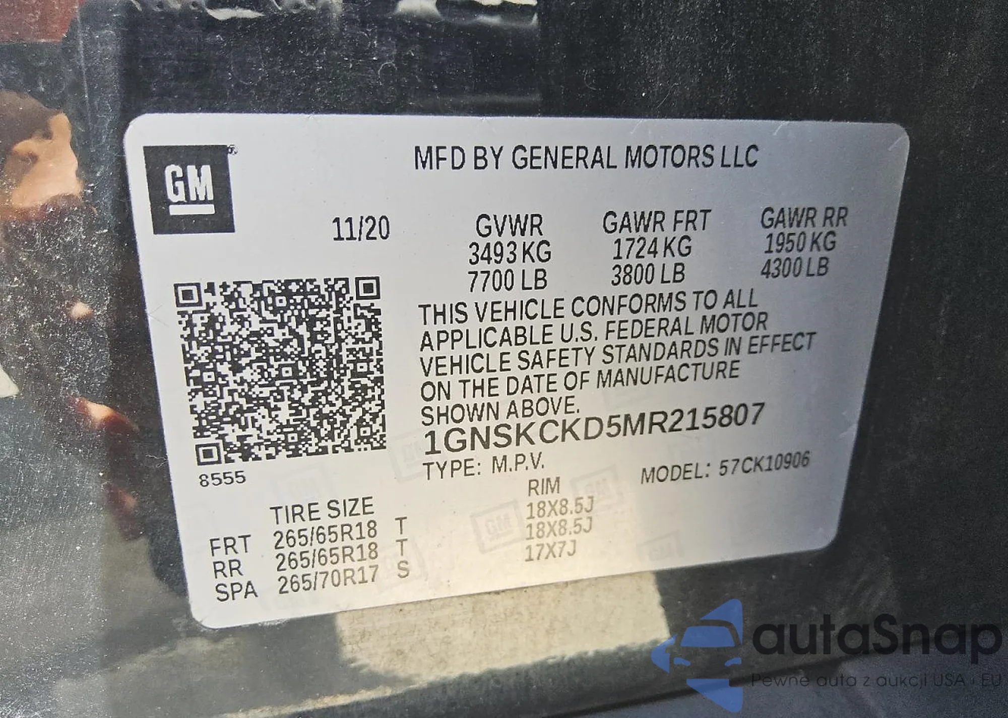 Samochód Chevrolet Suburban 2021 (VIN 1GNSKCKD5MR215807) ma dokumenty uniemożliwiające rejestrację. Mogą pojawić się trudności przy eksporcie i rejestracji. Skontaktuj się z ekspertami AutaSnap w celu znalezienia alternatywy.