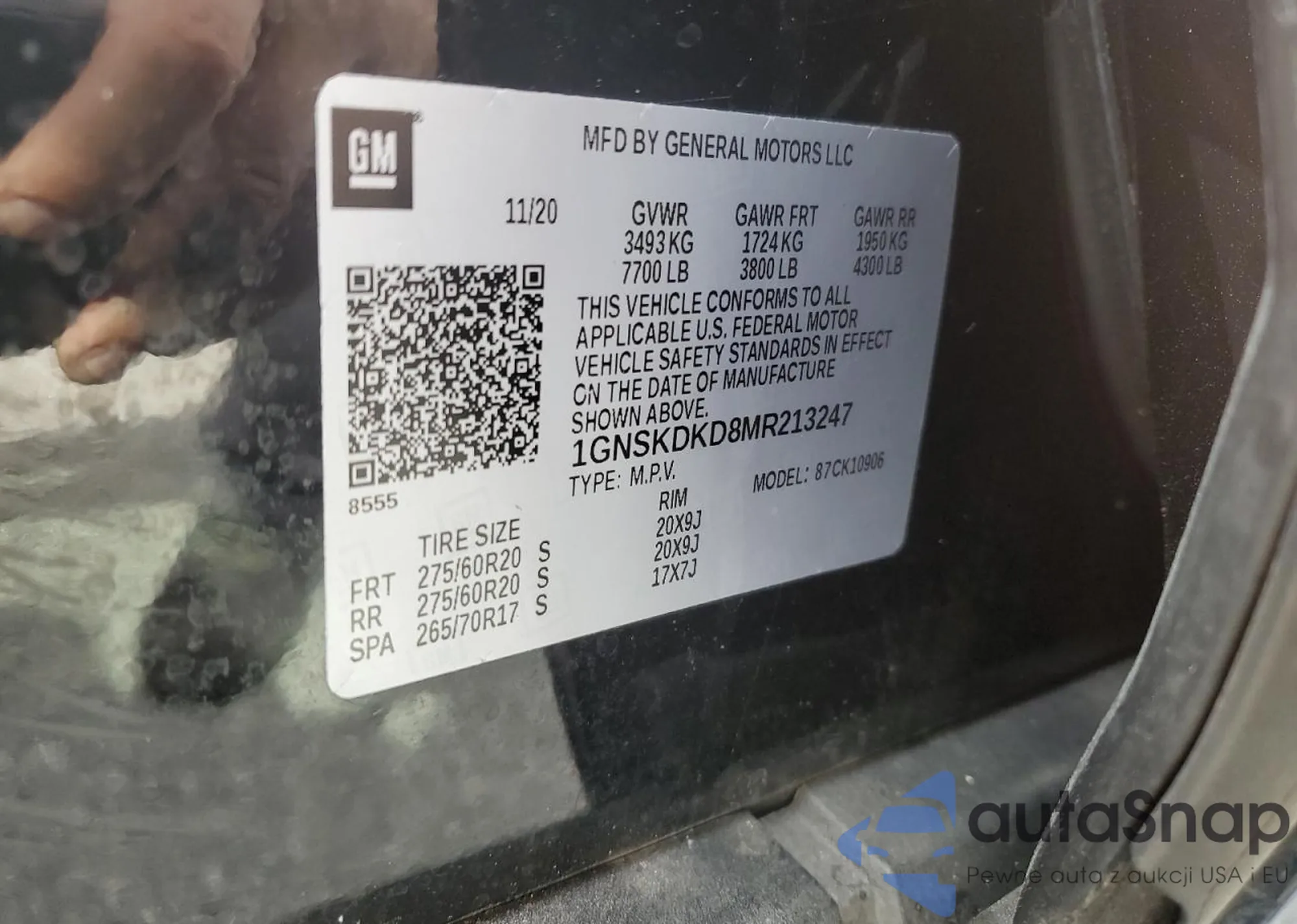 Samochód Chevrolet Suburban 2021 (VIN 1GNSKDKD8MR213247) ma dokumenty uniemożliwiające rejestrację. Mogą pojawić się trudności przy eksporcie i rejestracji. Skontaktuj się z ekspertami AutaSnap w celu znalezienia alternatywy.