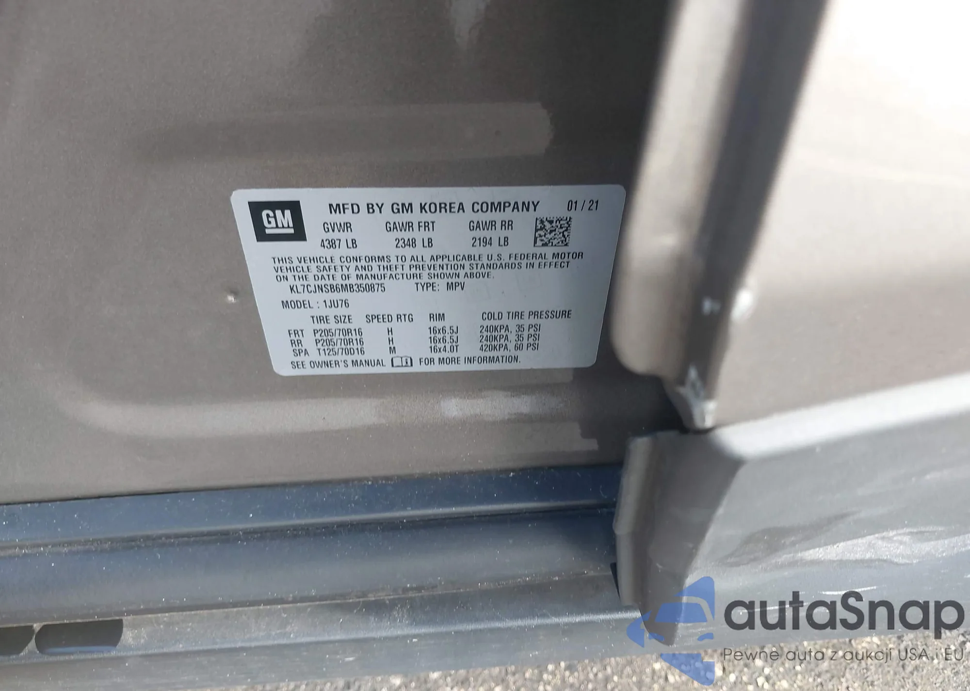 Samochód Chevrolet Trax 2021 (VIN KL7CJNSB6MB350875) ma dokumenty uniemożliwiające rejestrację. Mogą pojawić się trudności przy eksporcie i rejestracji. Skontaktuj się z ekspertami AutaSnap w celu znalezienia alternatywy.