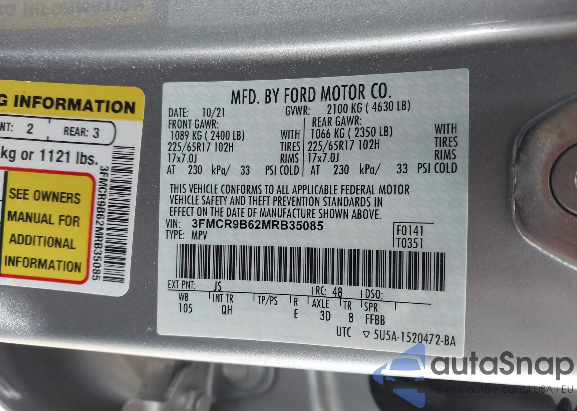 Samochód Ford Bronco Sport 2021 (VIN 3FMCR9B62MRB35085) nie był wcześniej licytowany. Dokumenty są czyste, przebieg odpowiada lub jest niższy niż średnia rynku. Sprzedaje go firma ubezpieczeniowa – polecamy zakup. Dostawa do portu zajmie ok. 6–8 tygodni.