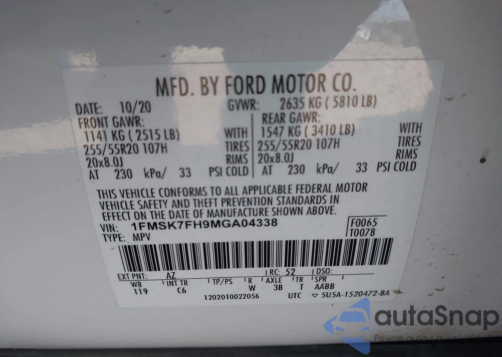 • VIN: 1FMSK7FH9MGA04338