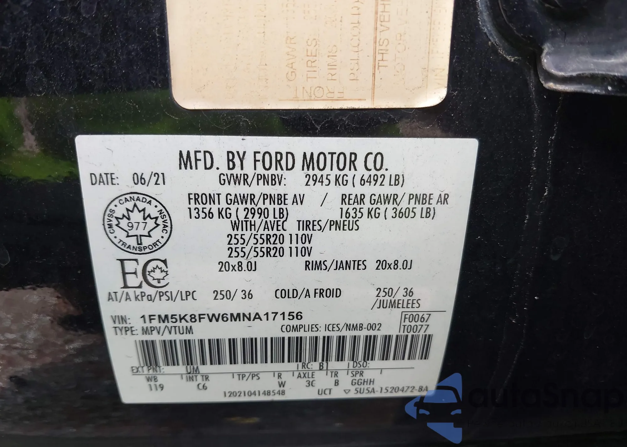 VIN: 1FM5K8FW6MNA17156
