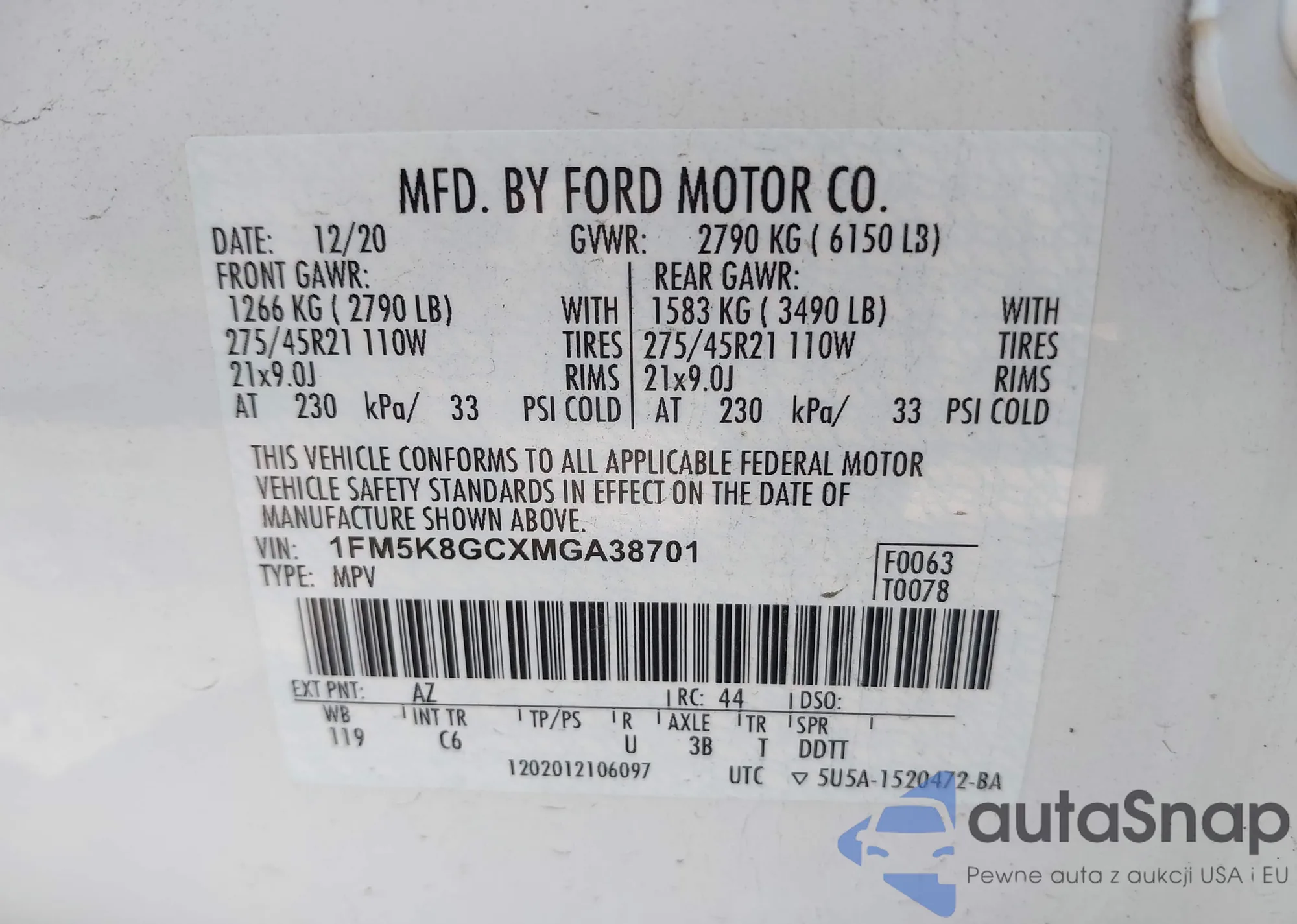 VIN: 1FM5K8GCXMGA38701