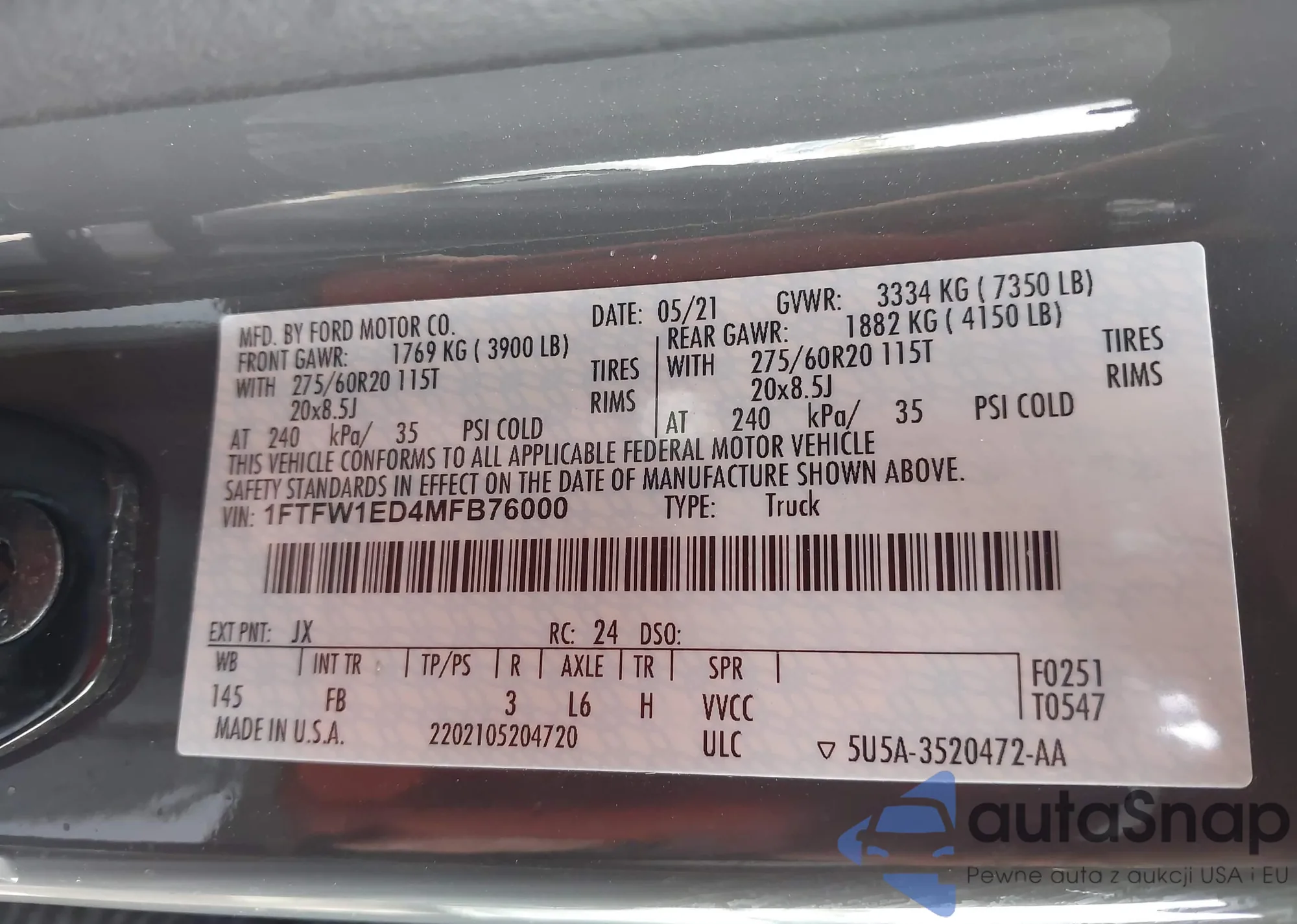 Samochód Ford F-150 2021 (VIN 1FTFW1ED4MFB76000) nie był wcześniej licytowany. Dokumenty są czyste, przebieg odpowiada lub jest niższy niż średnia rynku. Sprzedaje go firma ubezpieczeniowa – polecamy zakup. Dostawa do portu zajmie ok. 6–8 tygodni.