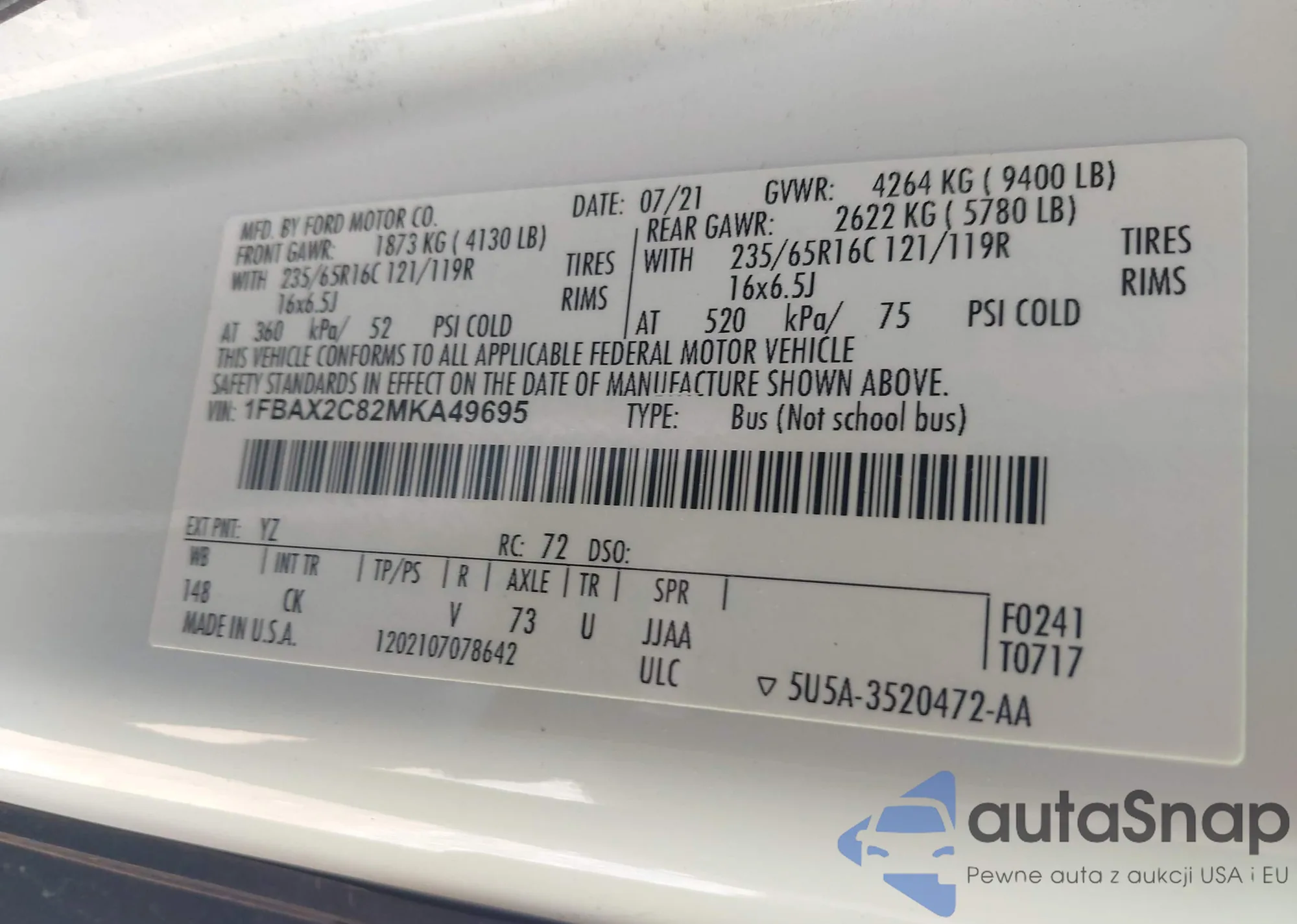 Samochód Ford Transit 2021 (VIN 1FBAX2C82MKA49695) nie był wcześniej licytowany. Dokumenty są czyste, przebieg odpowiada lub jest niższy niż średnia rynku. Sprzedaje go firma ubezpieczeniowa – polecamy zakup. Dostawa do portu zajmie ok. 6–8 tygodni.