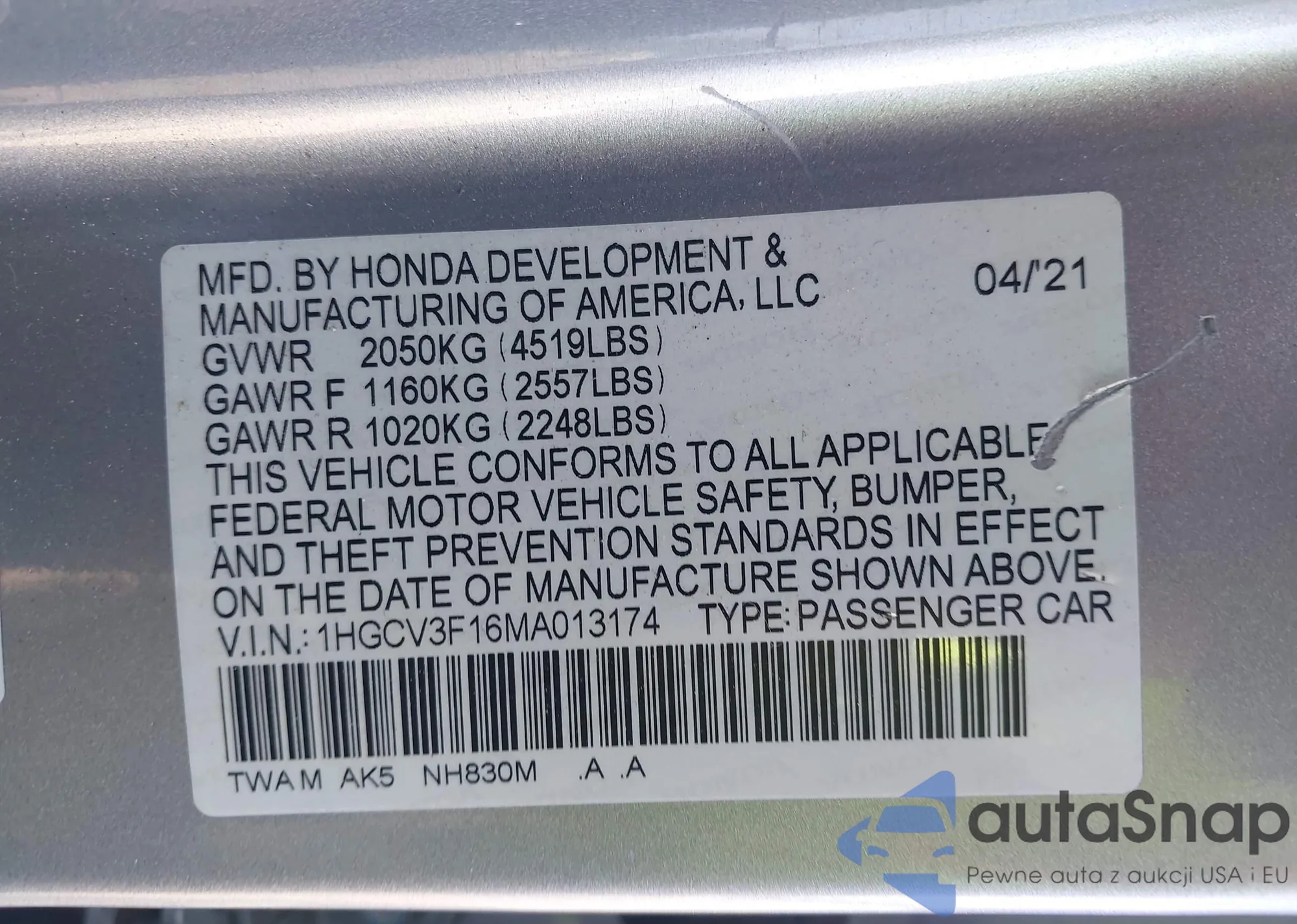 • VIN: 1HGCV3F16MA013174