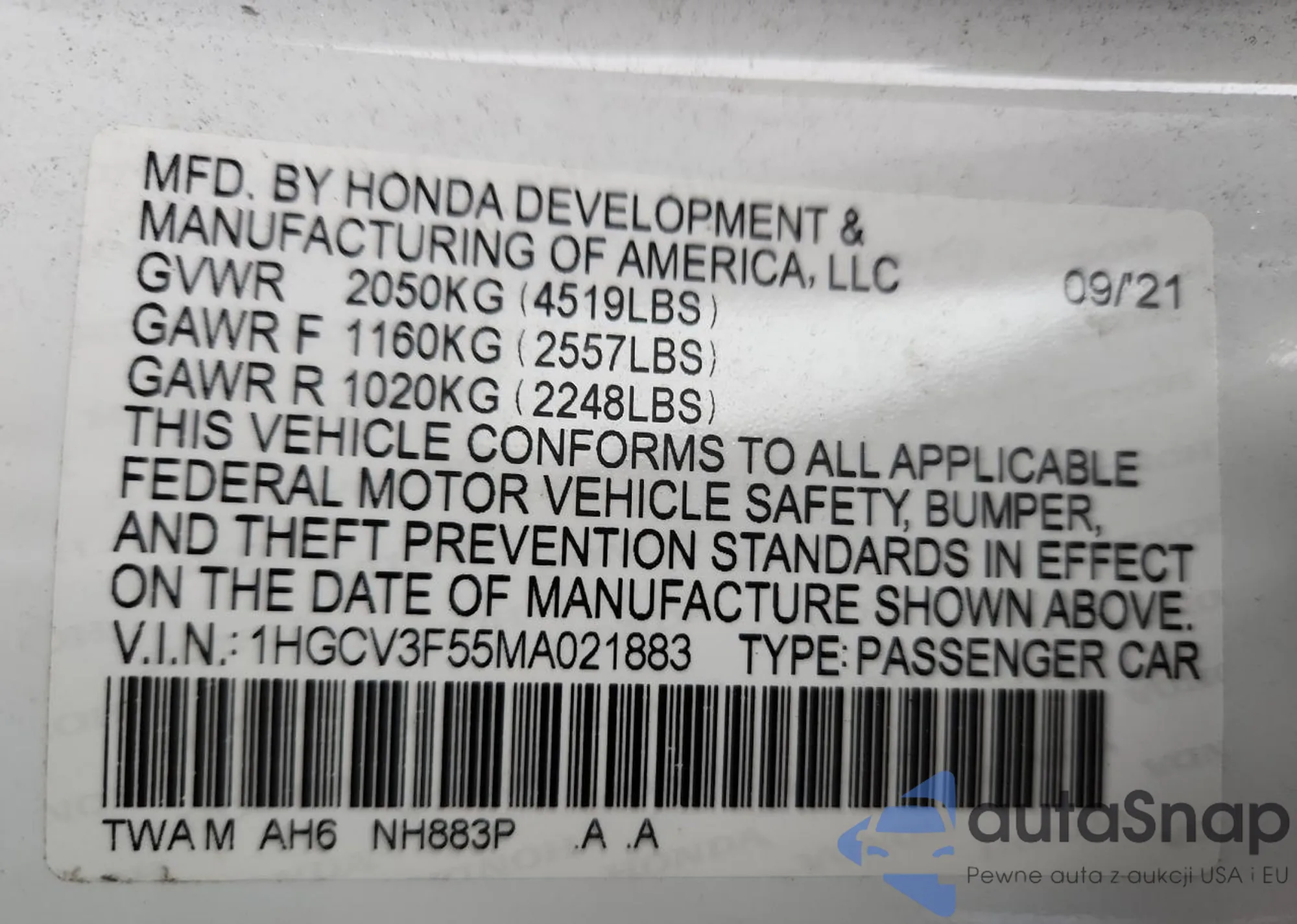 VIN: 1HGCV3F55MA021883