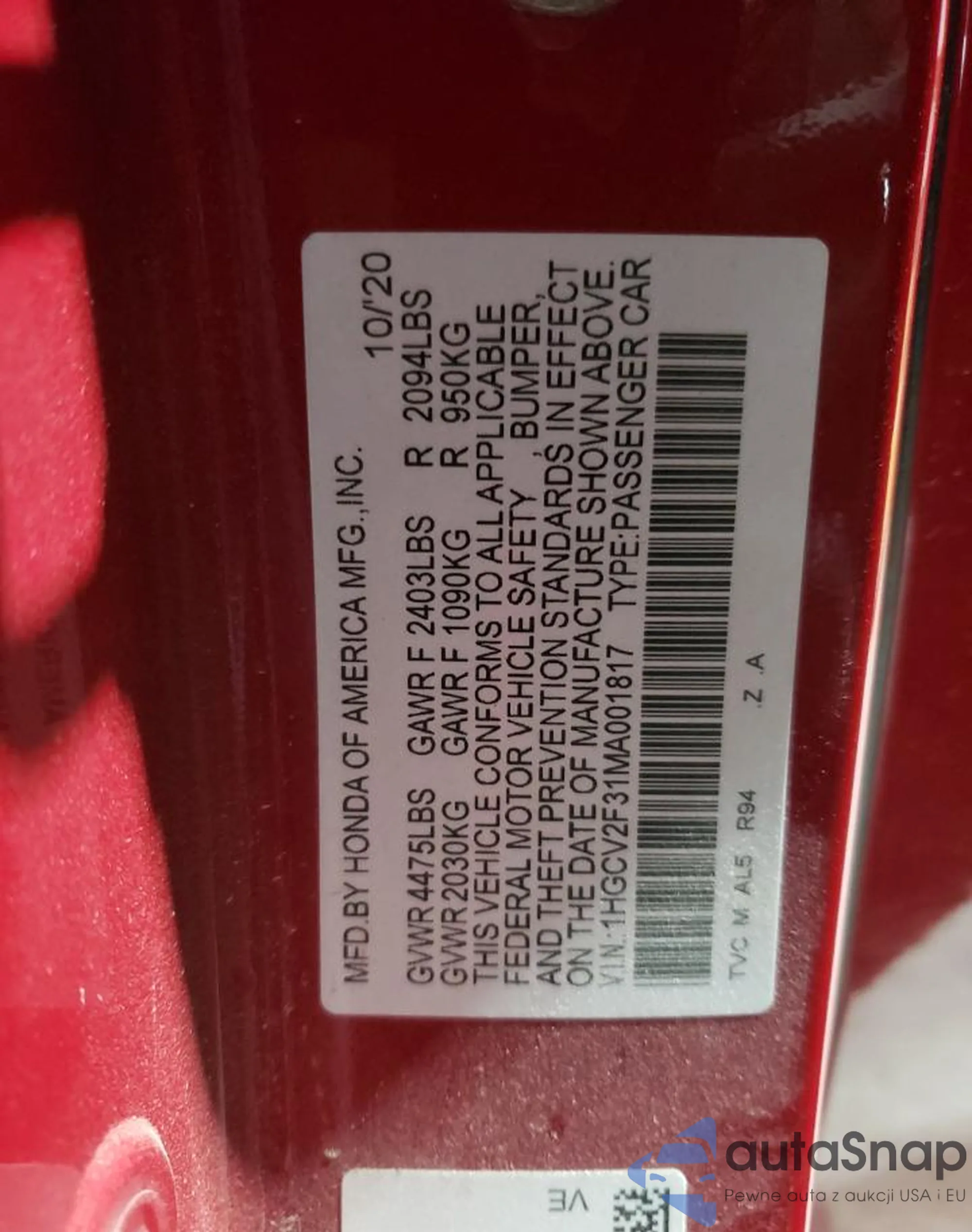 Samochód Honda Accord 2021 (VIN 1HGCV2F31MA001817) nie był wcześniej licytowany. Dokumenty są czyste, przebieg odpowiada lub jest niższy niż średnia rynku. Sprzedaje go firma ubezpieczeniowa – polecamy zakup. Dostawa do portu zajmie ok. 6–8 tygodni.